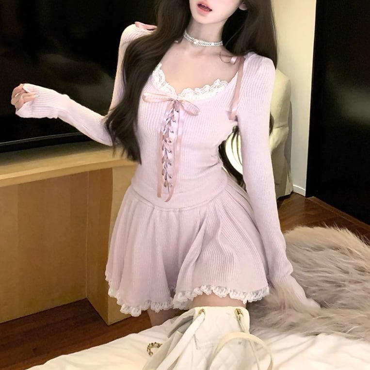 【2点セット】配色リボンヘムフリルワンピ+フリルストラップフレアジャンスカ ・50112