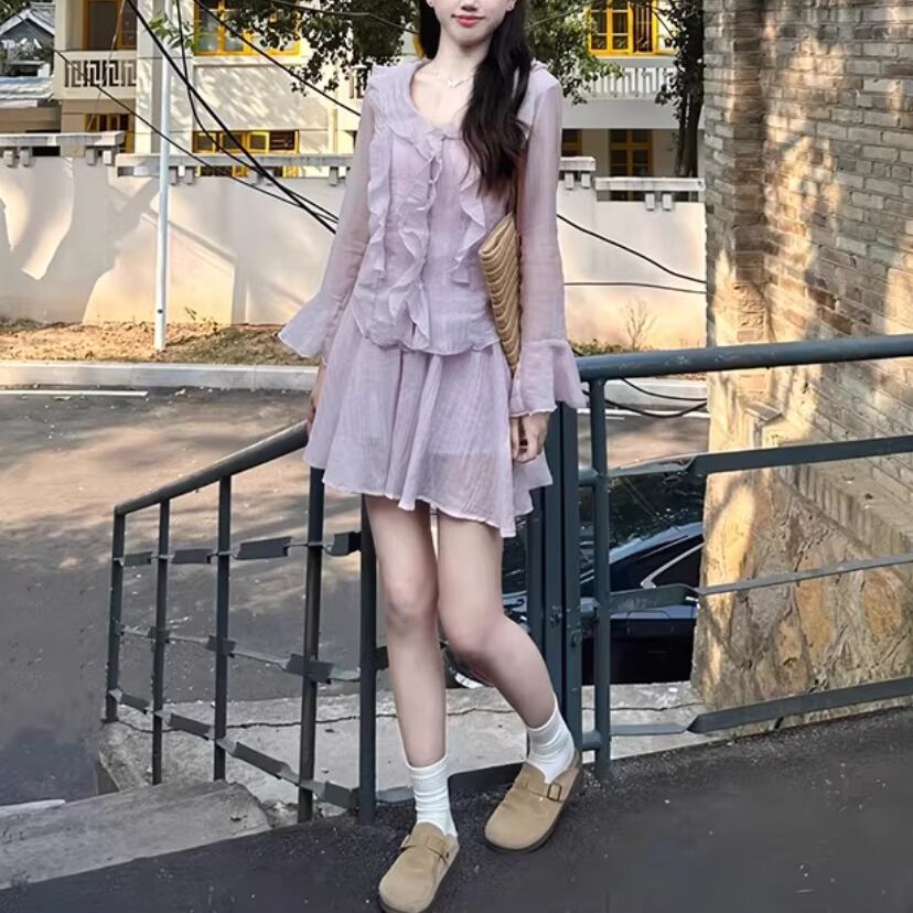 【2点セット】配色リボンヘムフリルワンピ+フリルストラップフレアジャンスカ ・50112