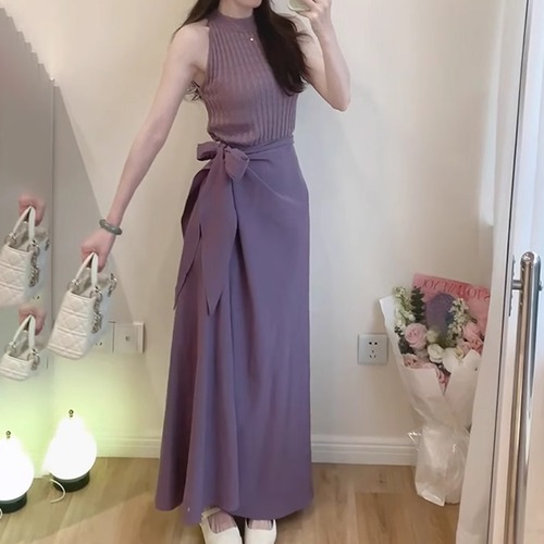 【2点セット】配色リボンヘムフリルワンピ+フリルストラップフレアジャンスカ ・50112