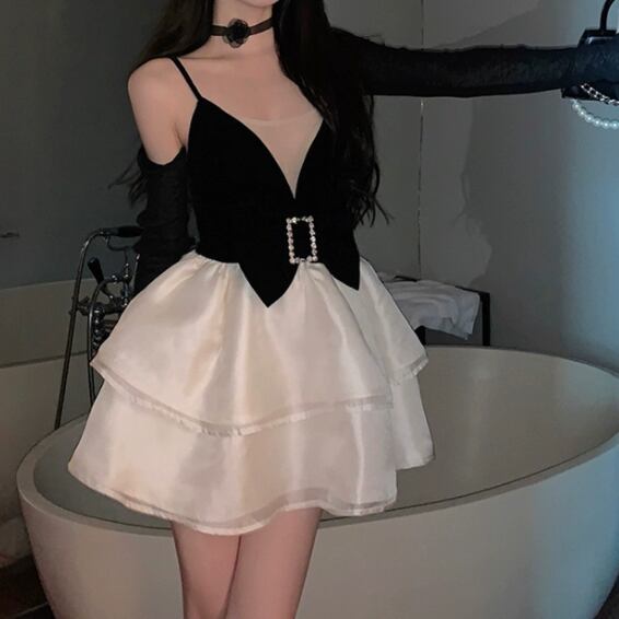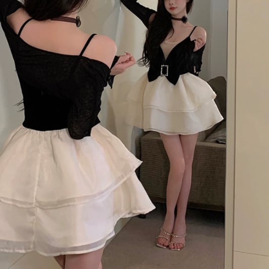 【2点セット】配色リボンヘムフリルワンピ+フリルストラップフレアジャンスカ ・50112
