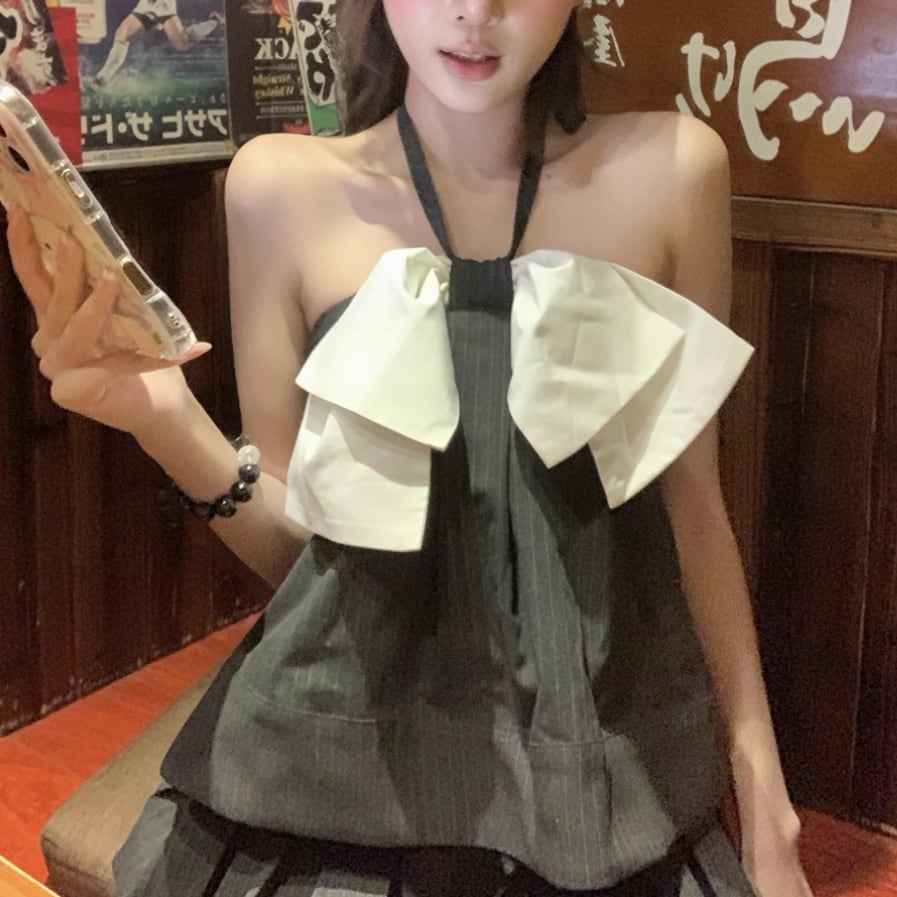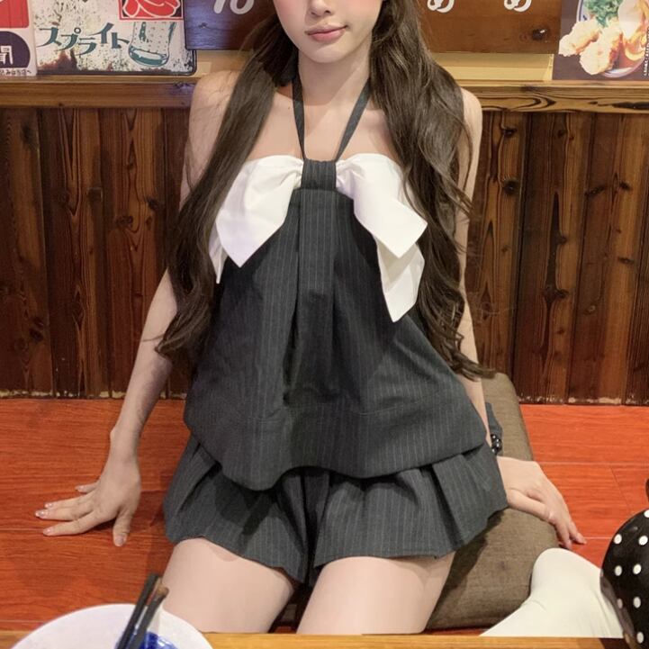 【2点セット】配色リボンヘムフリルワンピ+フリルストラップフレアジャンスカ ・50112