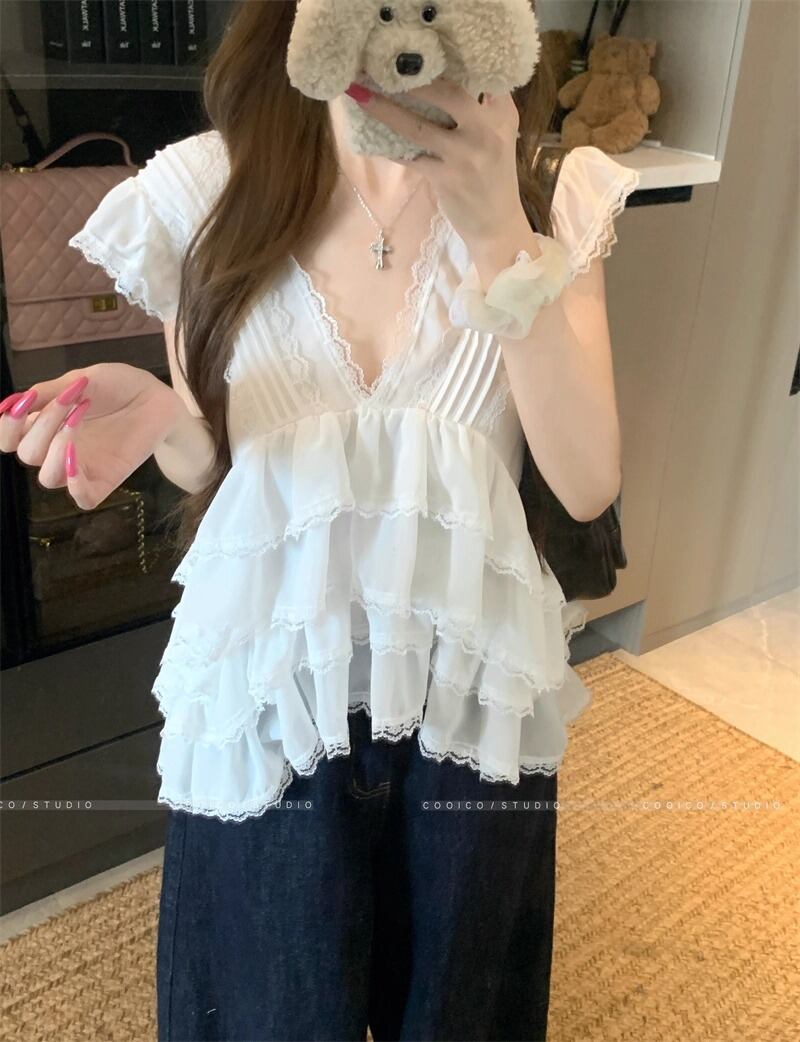 レースカラーアシメボタンドッキングトップス ・71106