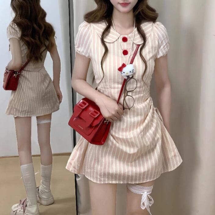 【2点セット】ストライプ柄パフスリーブワンピ+ベルト ・68546