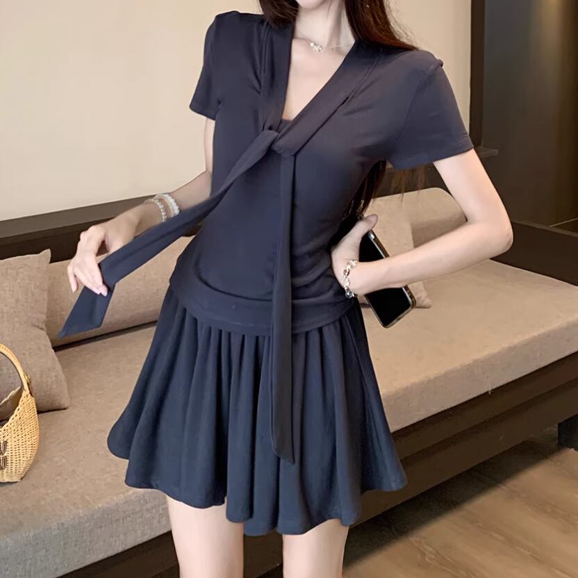 【2点セット】配色リボンヘムフリルワンピ+フリルストラップフレアジャンスカ ・50112