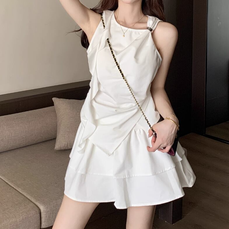 【2点セット】配色リボンヘムフリルワンピ+フリルストラップフレアジャンスカ ・50112
