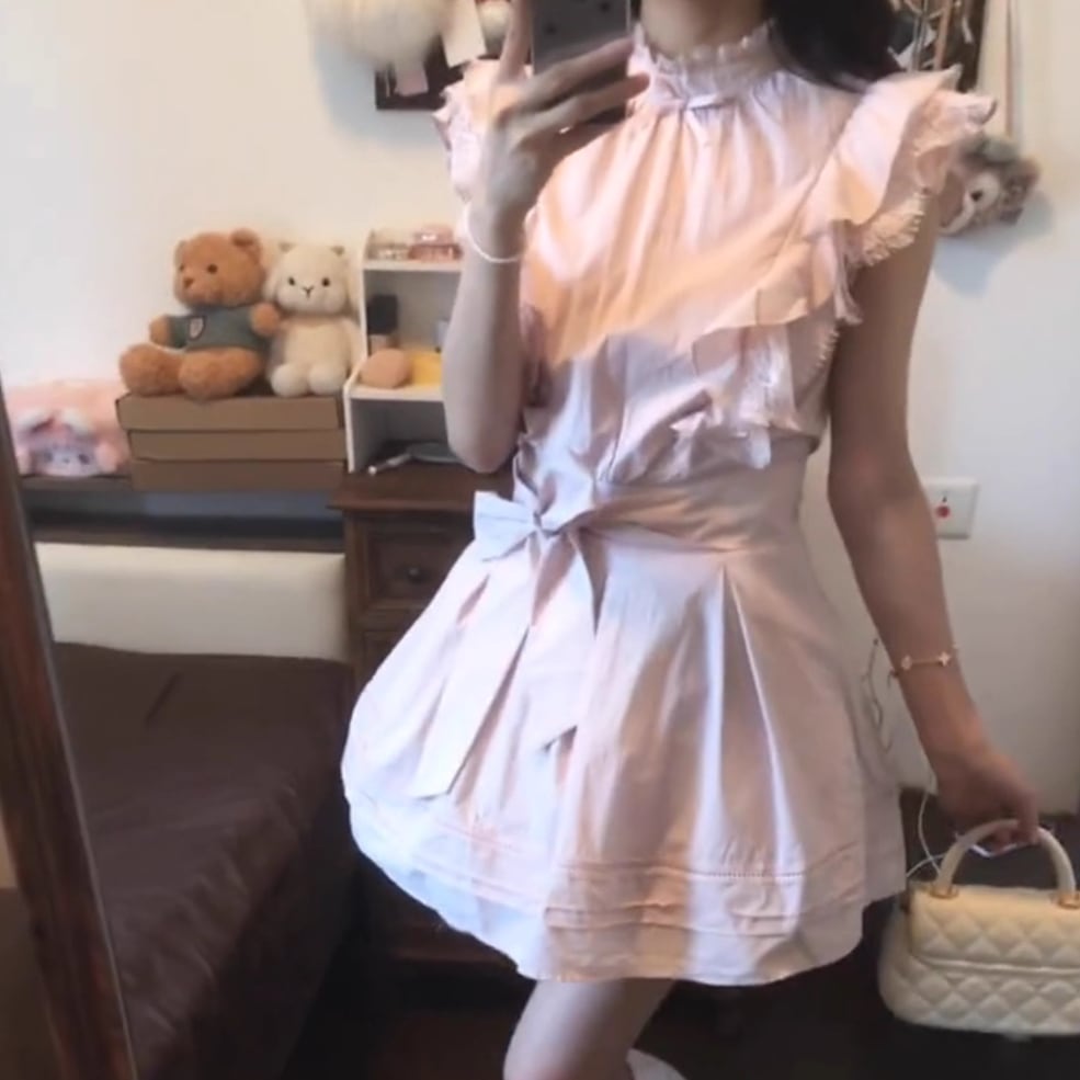 【2点セット】配色リボンヘムフリルワンピ+フリルストラップフレアジャンスカ ・50112