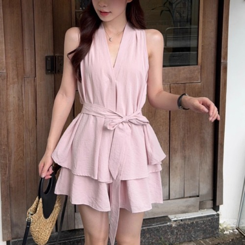 【2点セット】配色リボンヘムフリルワンピ+フリルストラップフレアジャンスカ ・50112