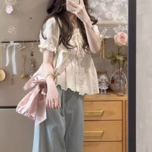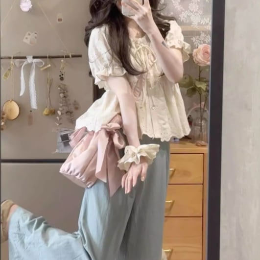 ボリュームスリーブレースラウンドカラーブラウス ・67546