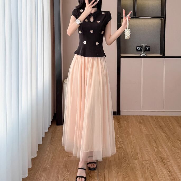 【2点セット】配色リボンヘムフリルワンピ+フリルストラップフレアジャンスカ ・50112