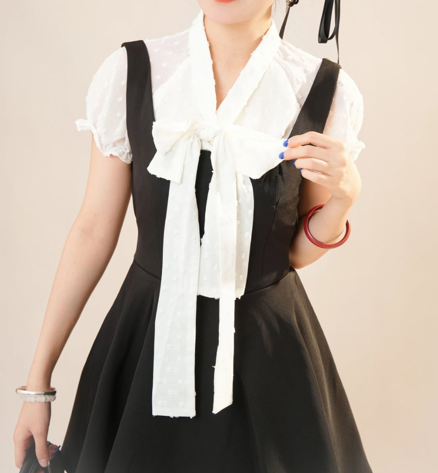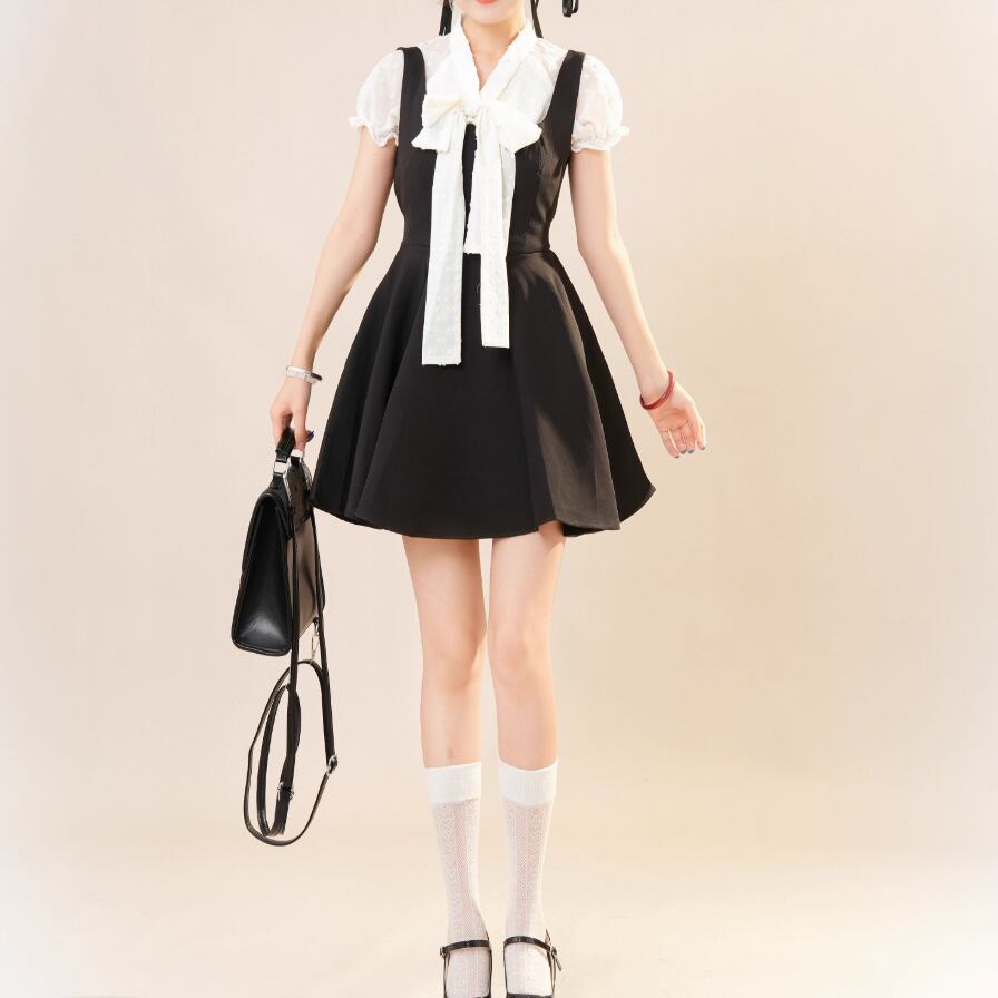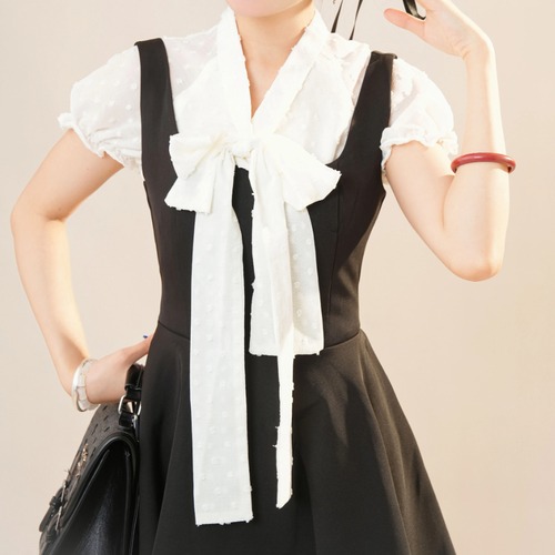 【2点セット】配色リボンヘムフリルワンピ+フリルストラップフレアジャンスカ ・50112