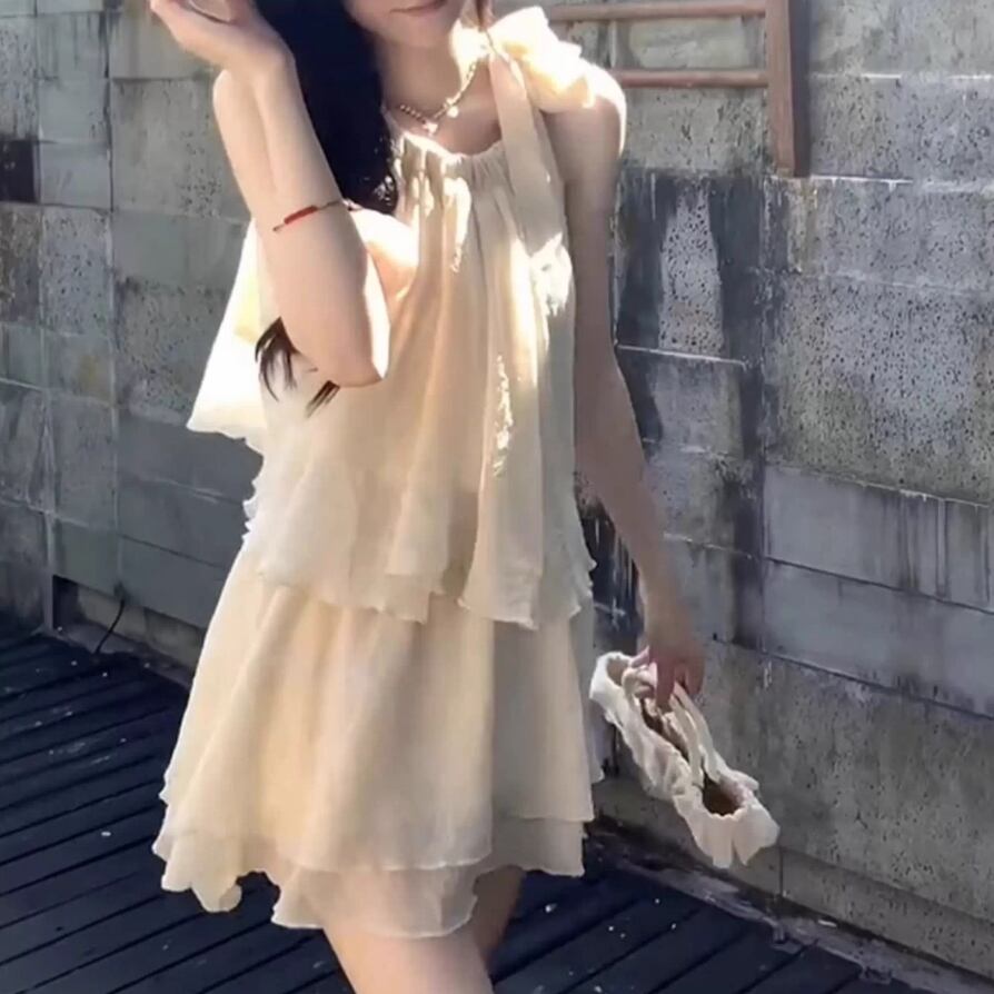 【2点セット】配色リボンヘムフリルワンピ+フリルストラップフレアジャンスカ ・50112