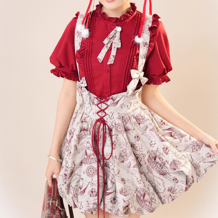 【2点セット】配色リボンヘムフリルワンピ+フリルストラップフレアジャンスカ ・50112