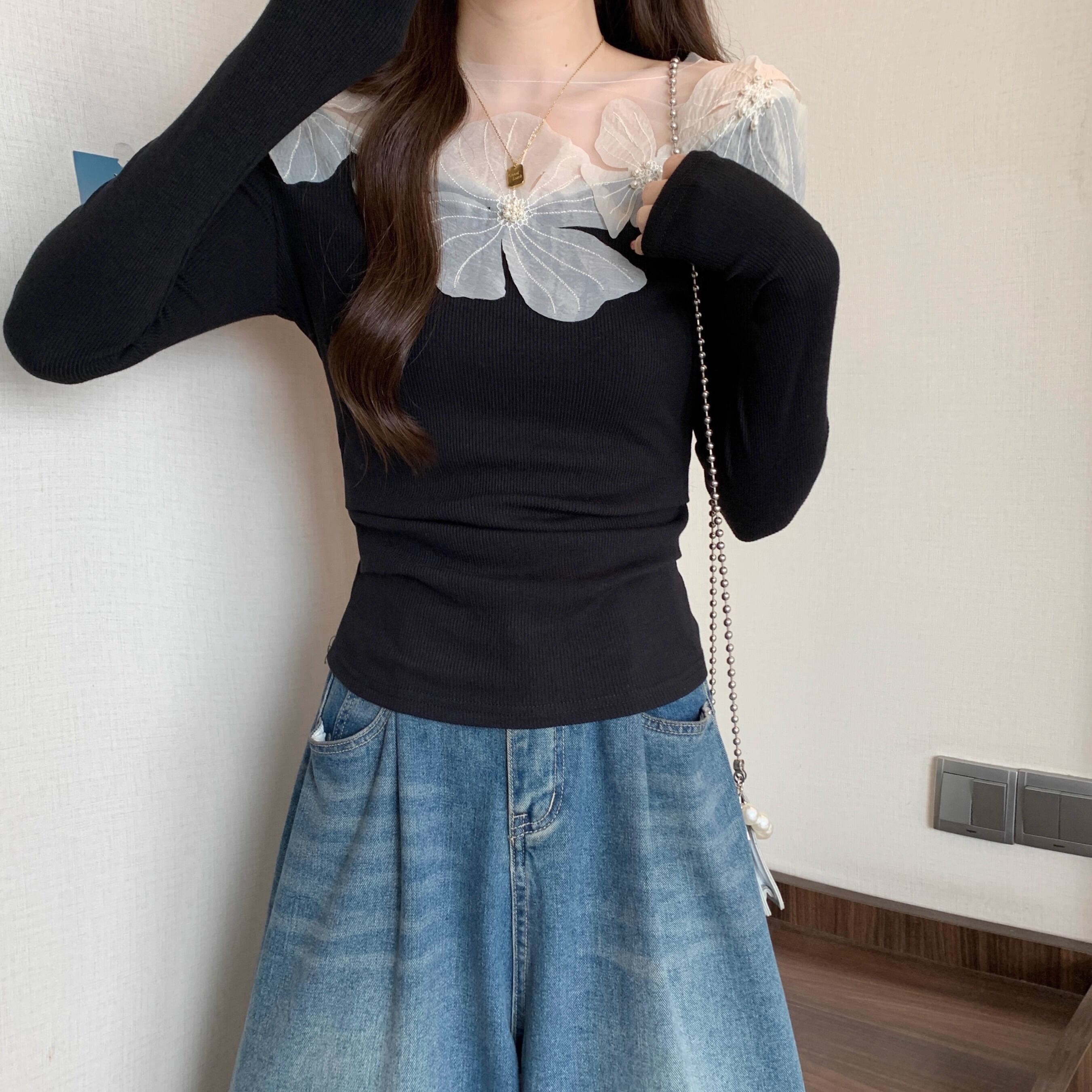 レースカラーアシメボタンドッキングトップス ・71106