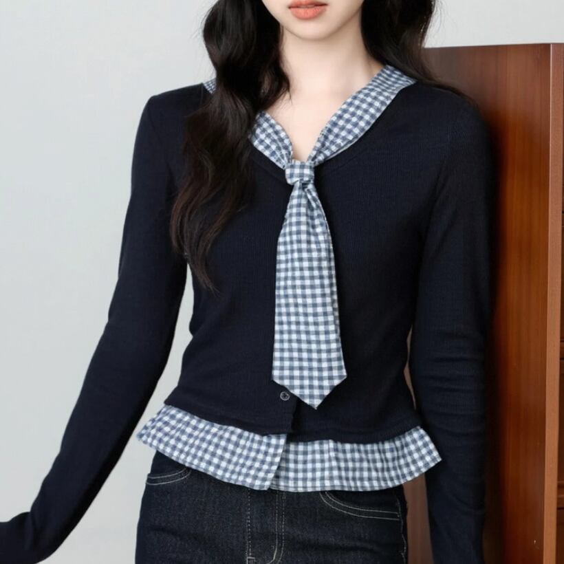 レースカラーアシメボタンドッキングトップス ・71106
