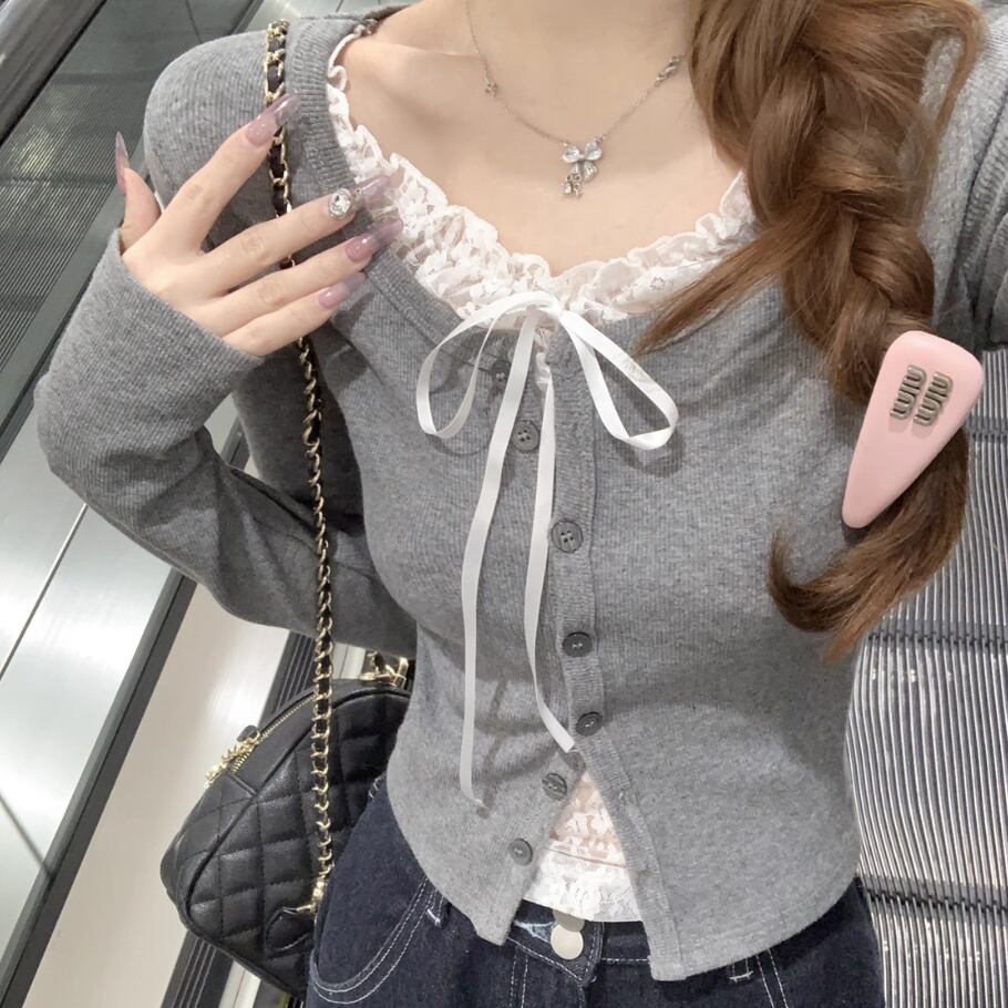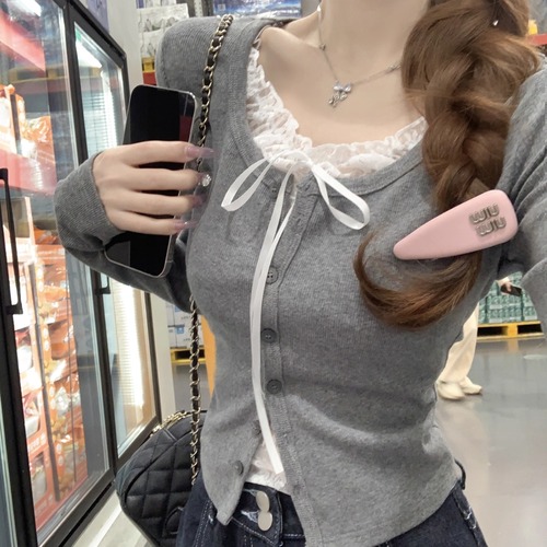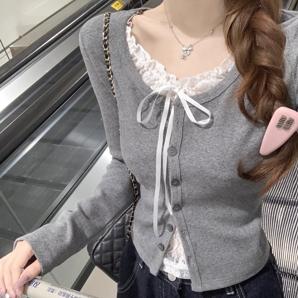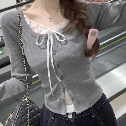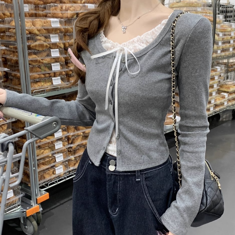 レースカラーアシメボタンドッキングトップス ・71106