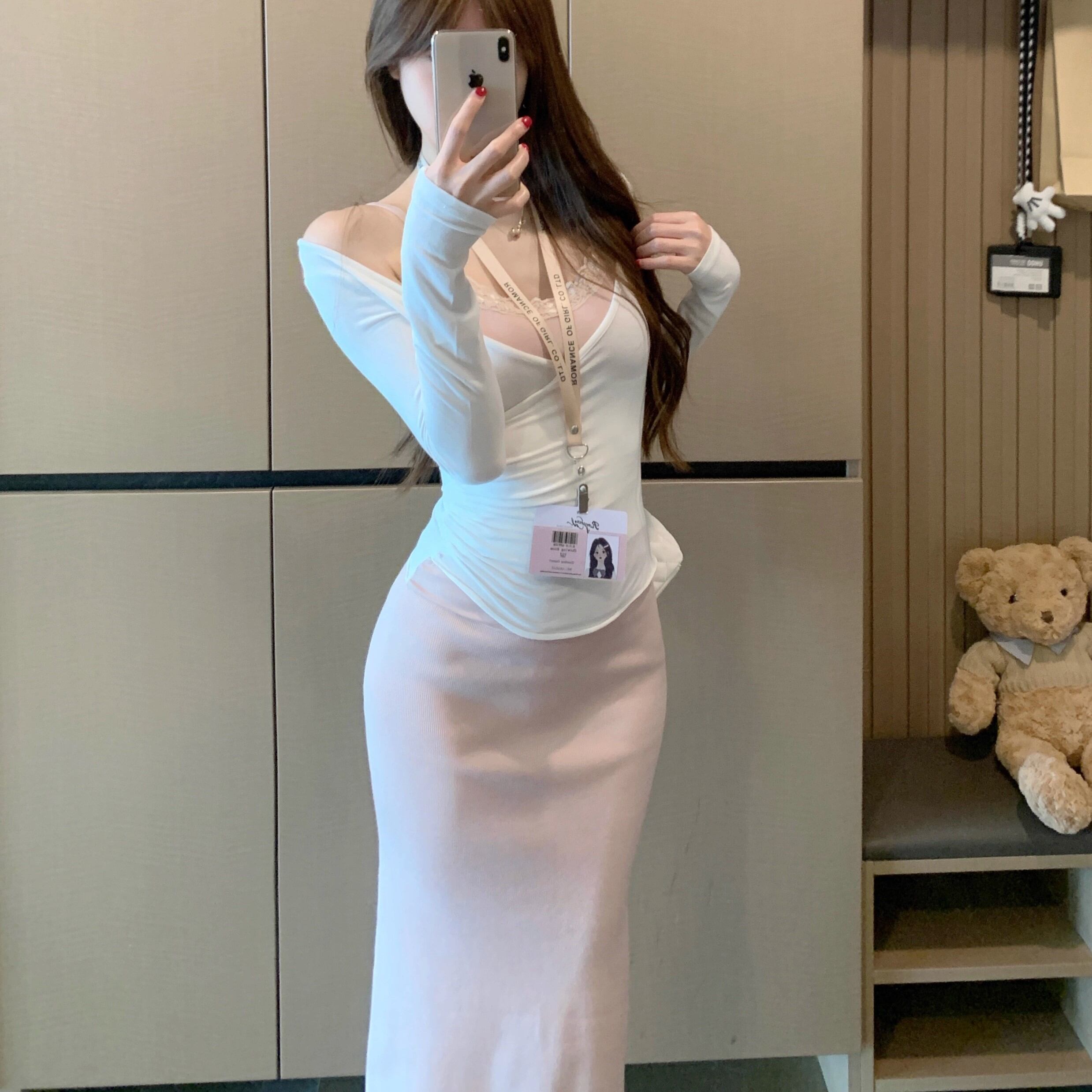 【2点セット】配色リボンヘムフリルワンピ+フリルストラップフレアジャンスカ ・50112