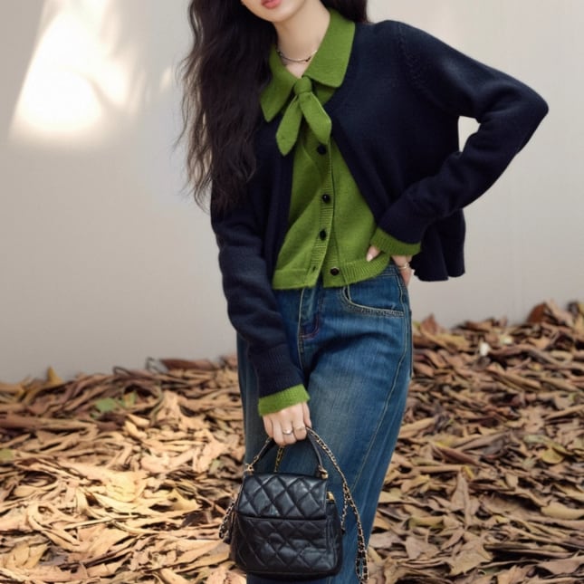 4色/Vネックフリルリボンケーブルニット ・66138