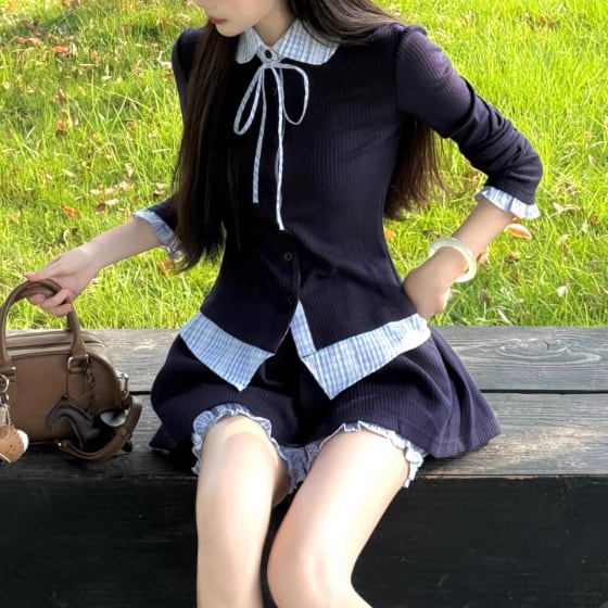 【2点セット】配色リボンヘムフリルワンピ+フリルストラップフレアジャンスカ ・50112