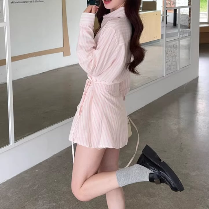 【2点セット】ストライプ柄パフスリーブワンピ+ベルト ・68546