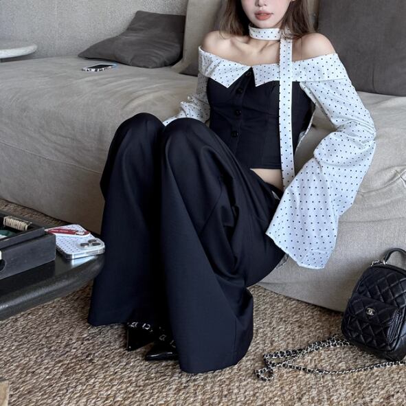【2点セット】ボウタイカラートップス+サイドレースリボンパンツ ・75530
