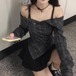 【2点セット】配色リボンヘムフリルワンピ+フリルストラップフレアジャンスカ ・50112