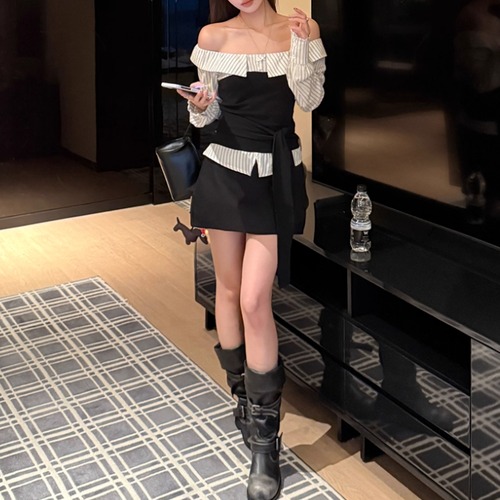 【2点セット】配色リボンヘムフリルワンピ+フリルストラップフレアジャンスカ ・50112
