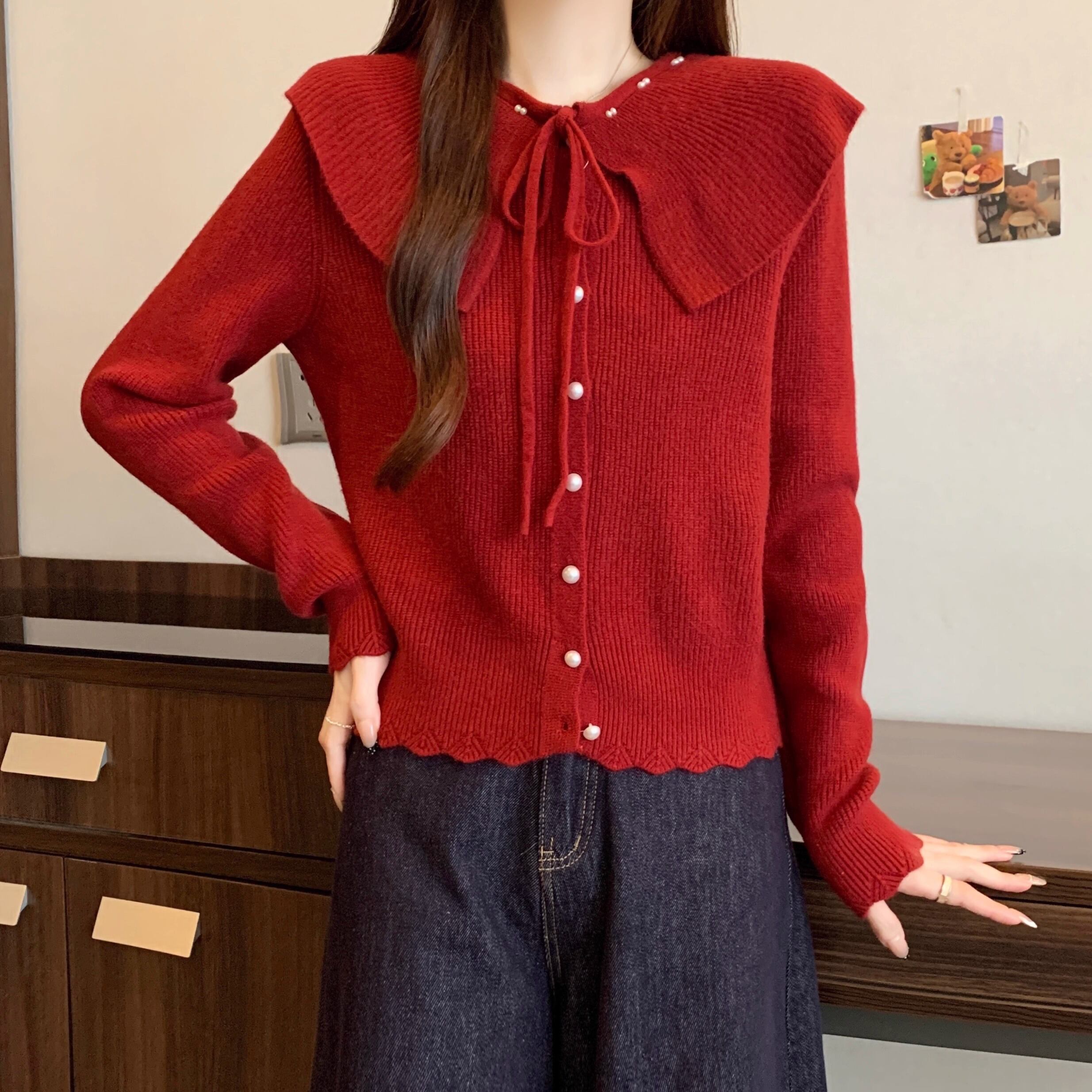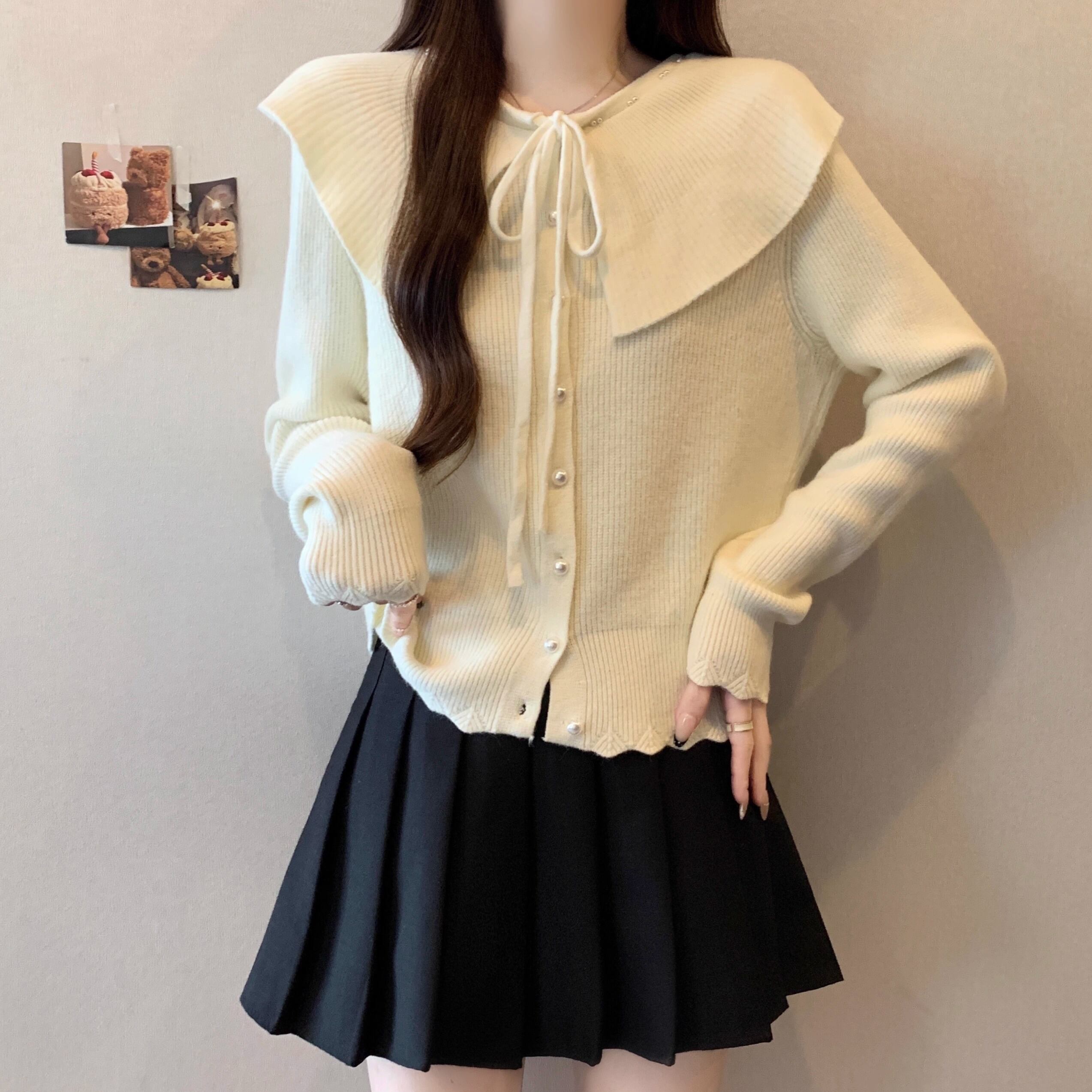 4色/Vネックフリルリボンケーブルニット ・66138
