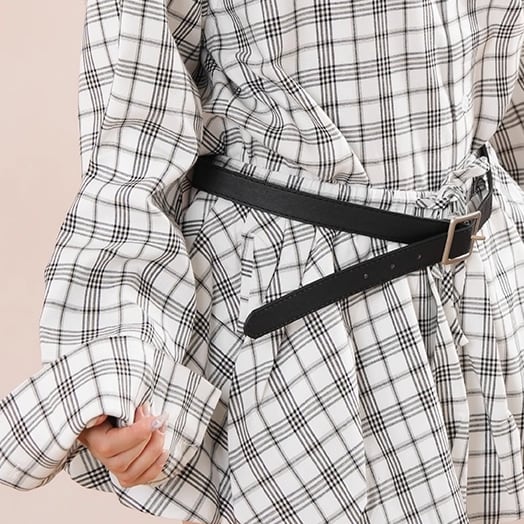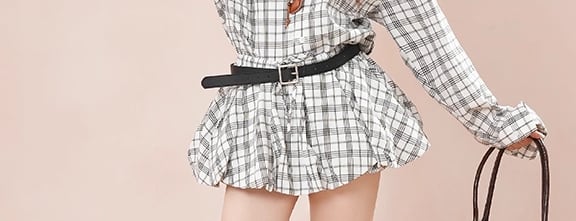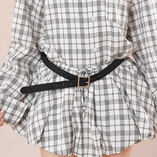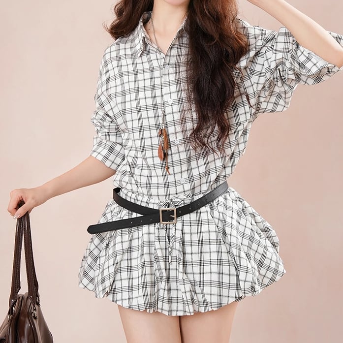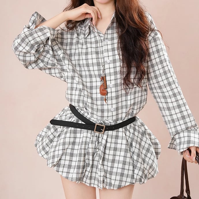 【2点セット】2色/ハイネックトップス+サイドベルトチェックジャンスカ ・72066