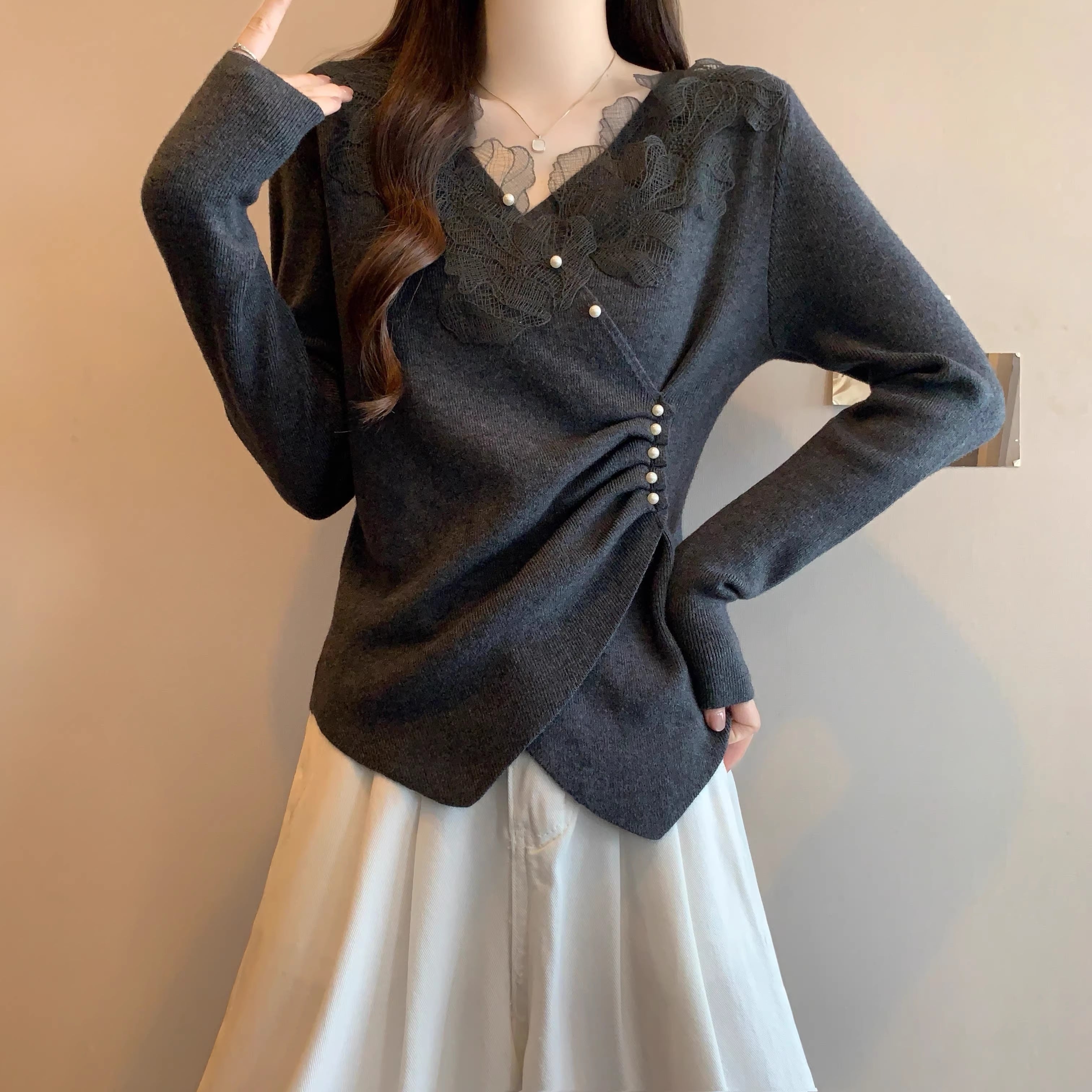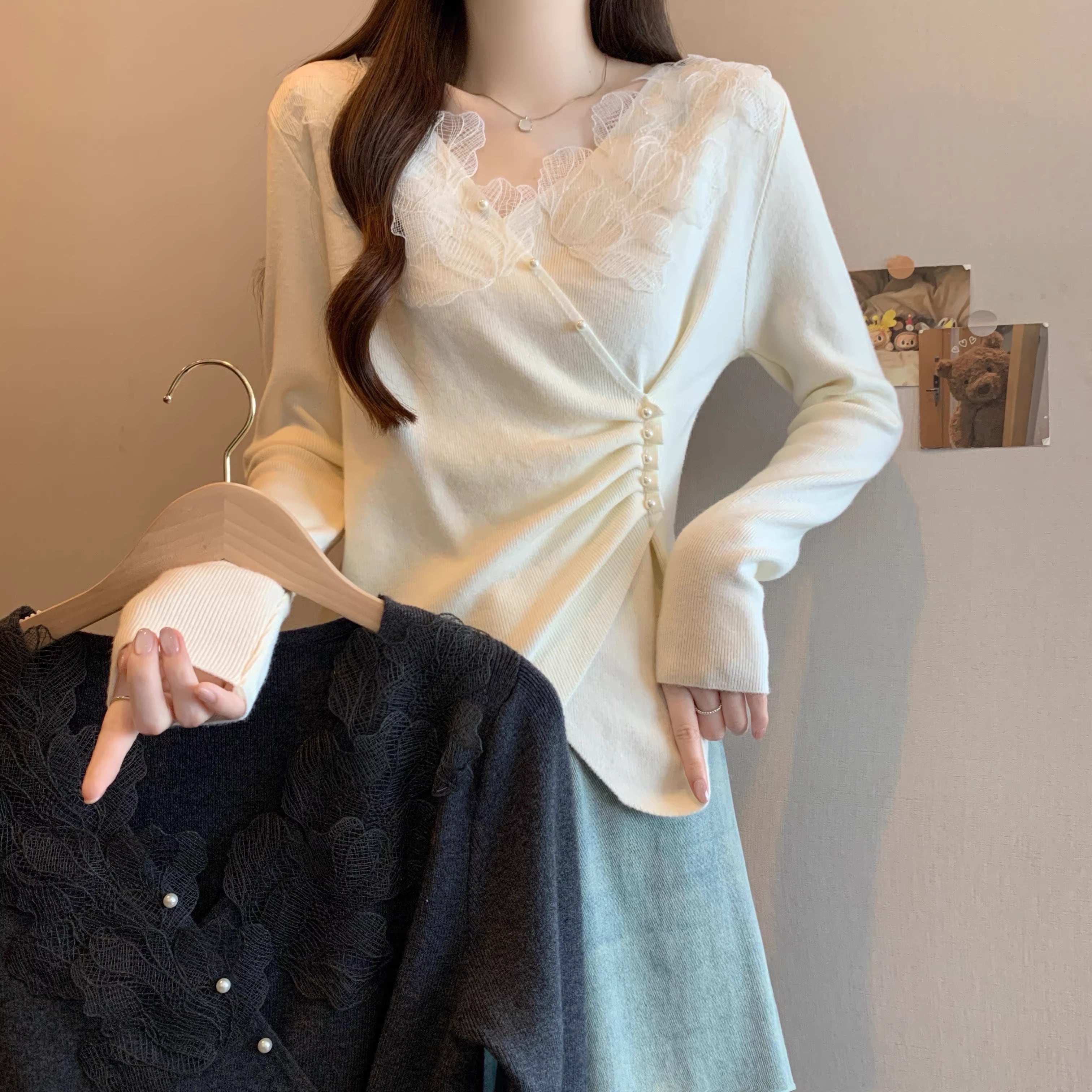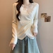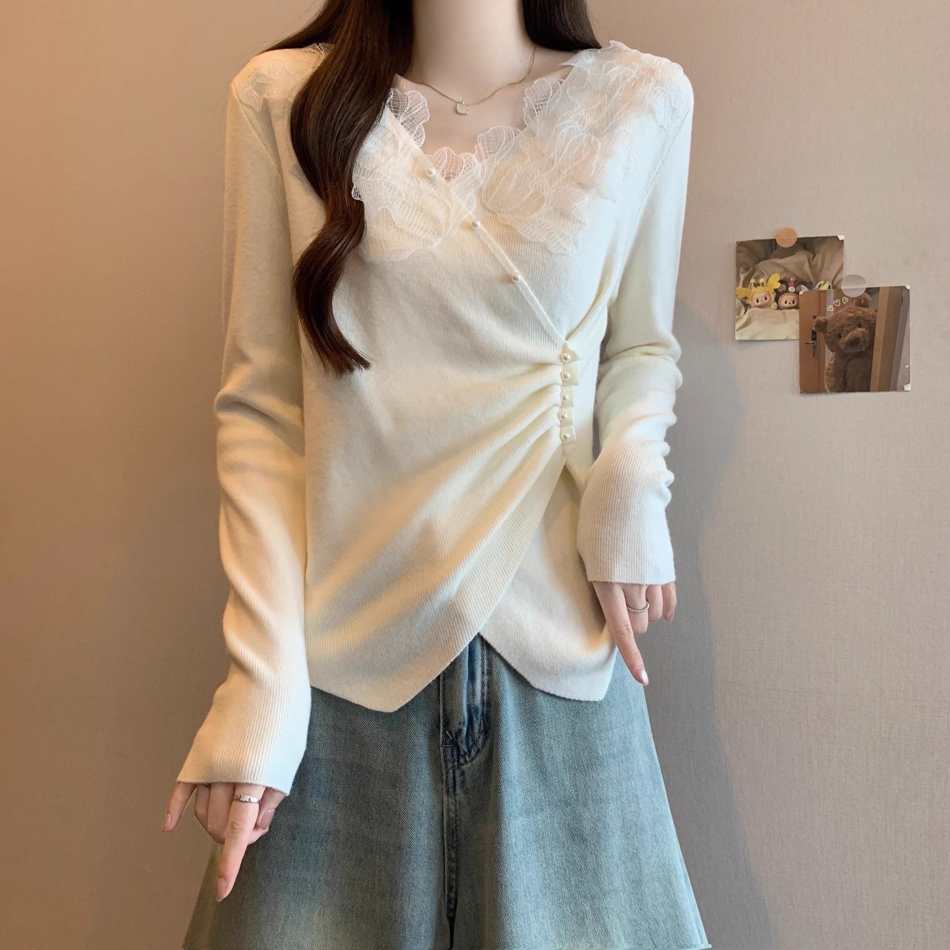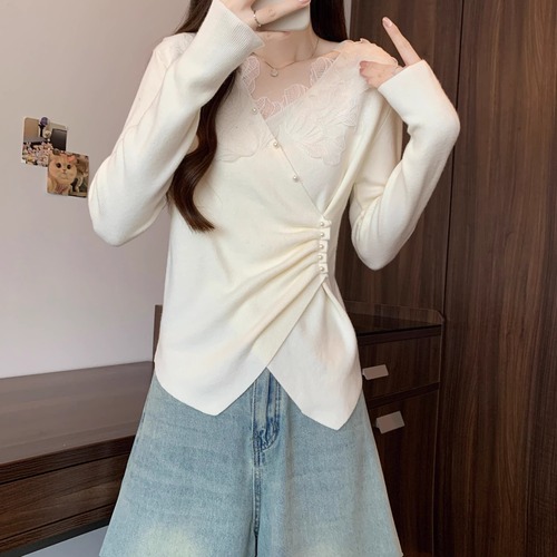 レースカラーアシメボタンドッキングトップス ・71106