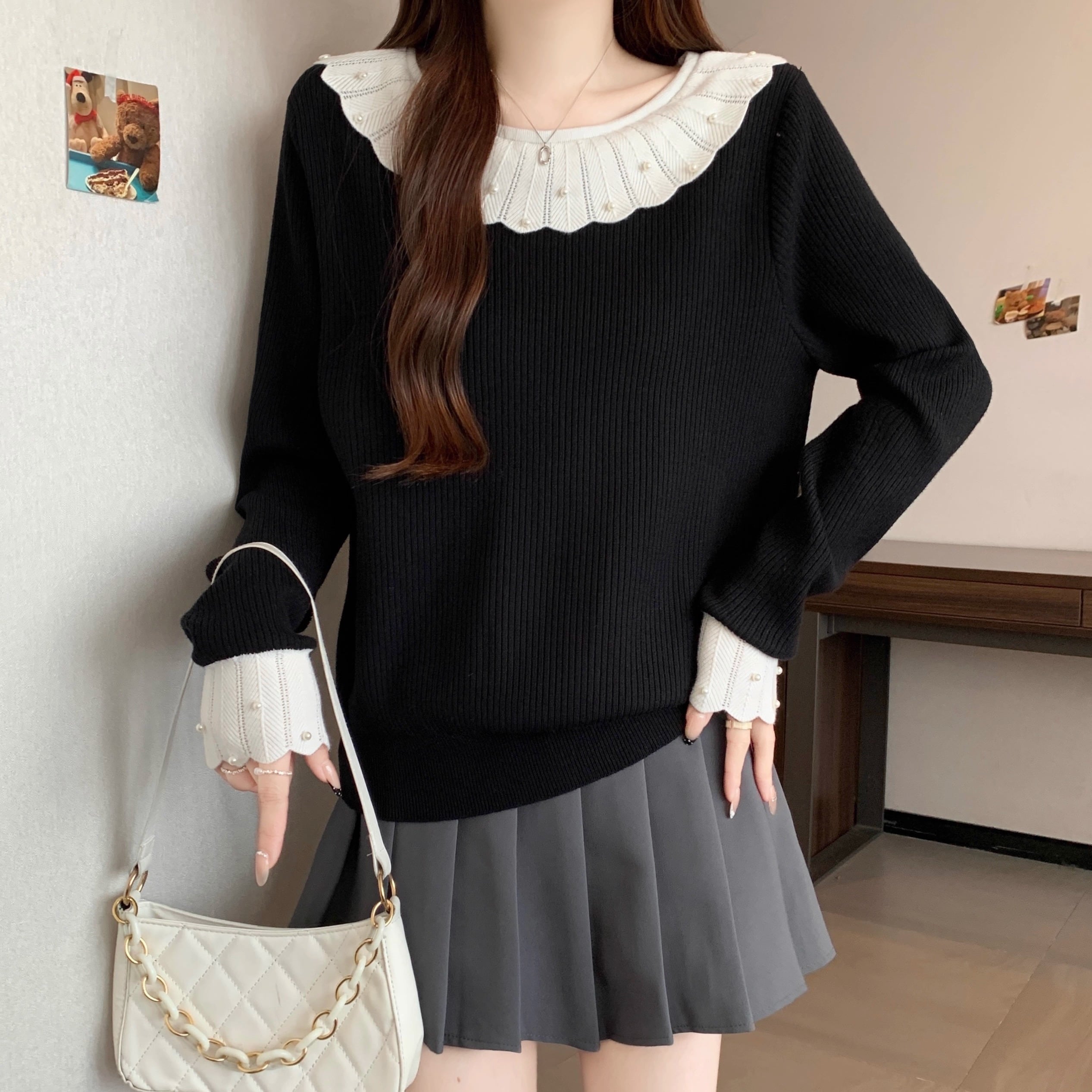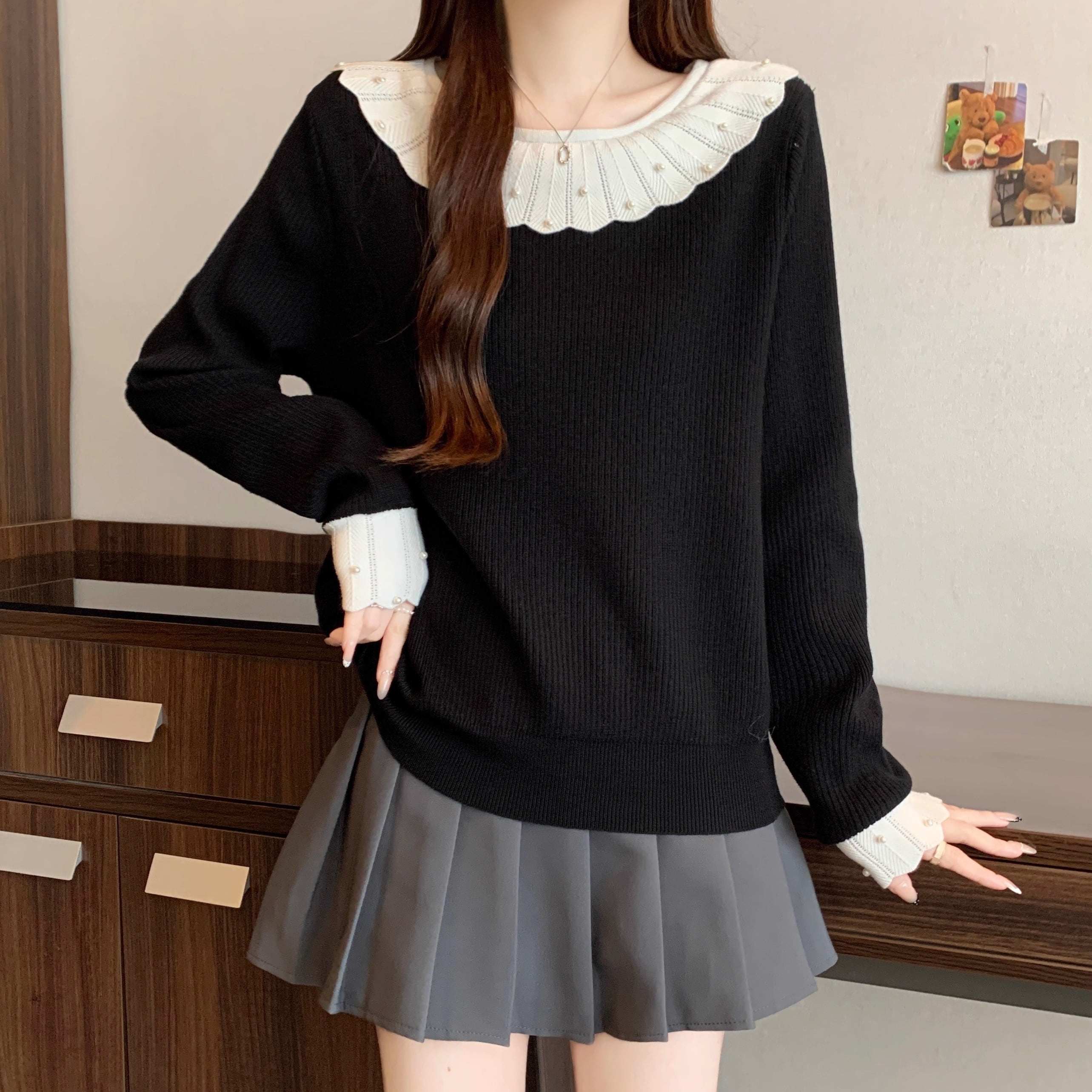 2色/レースチョーカーネックパフニットトップス ・73690