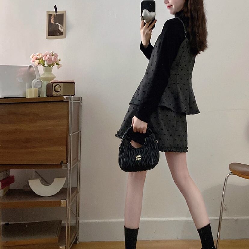 【2点セット】2色/ハイネックトップス+サイドベルトチェックジャンスカ ・72066