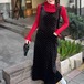 【2点セット】2色/ハイネックトップス+サイドベルトチェックジャンスカ ・72066