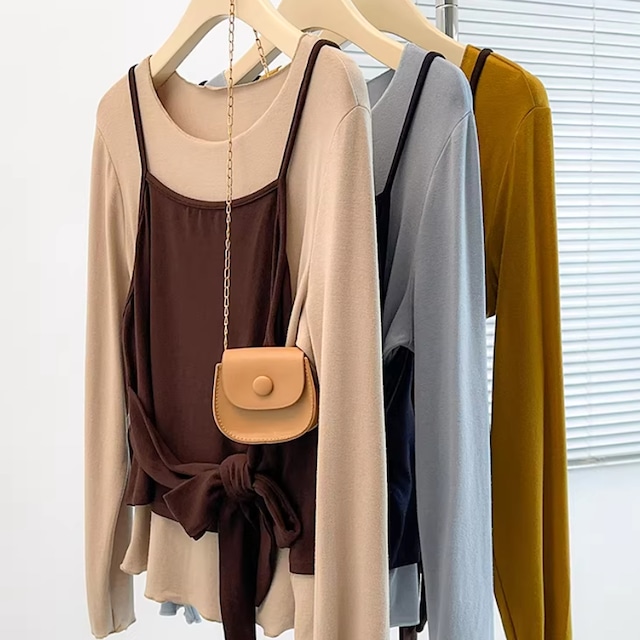 【2点セット】3色/ラウンドネックカットソー+ウエストリボンキャミソール ・74052