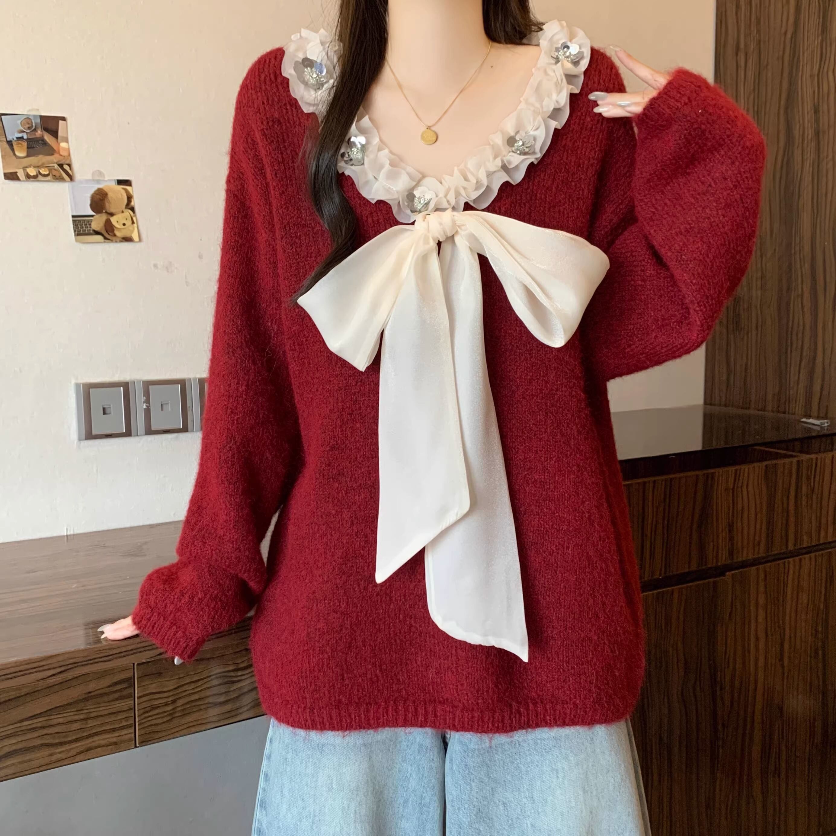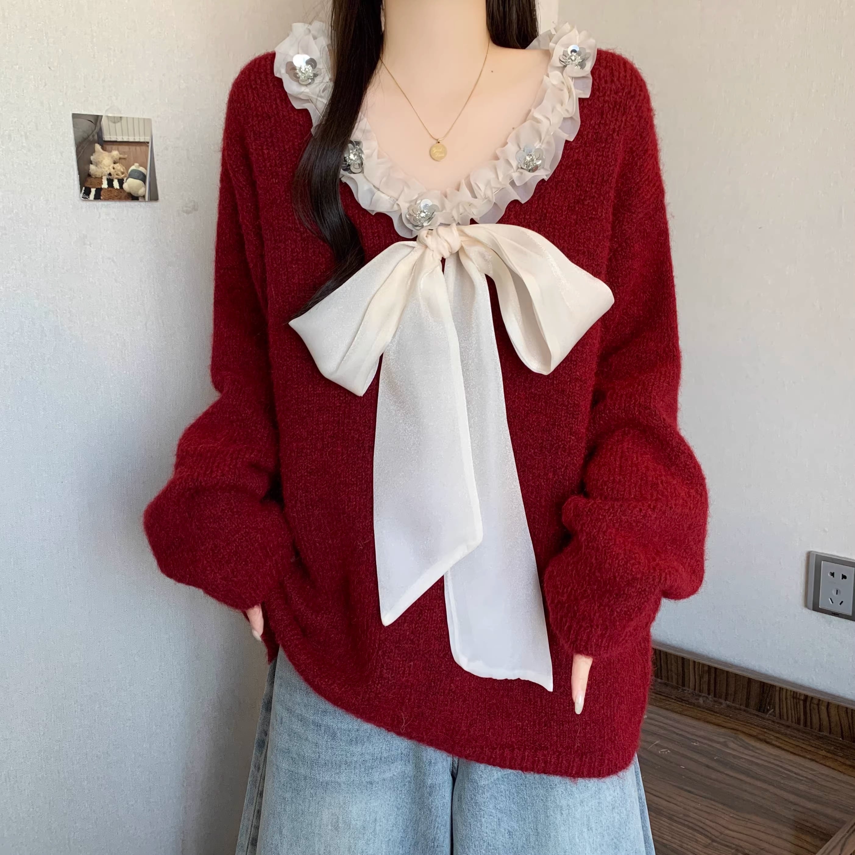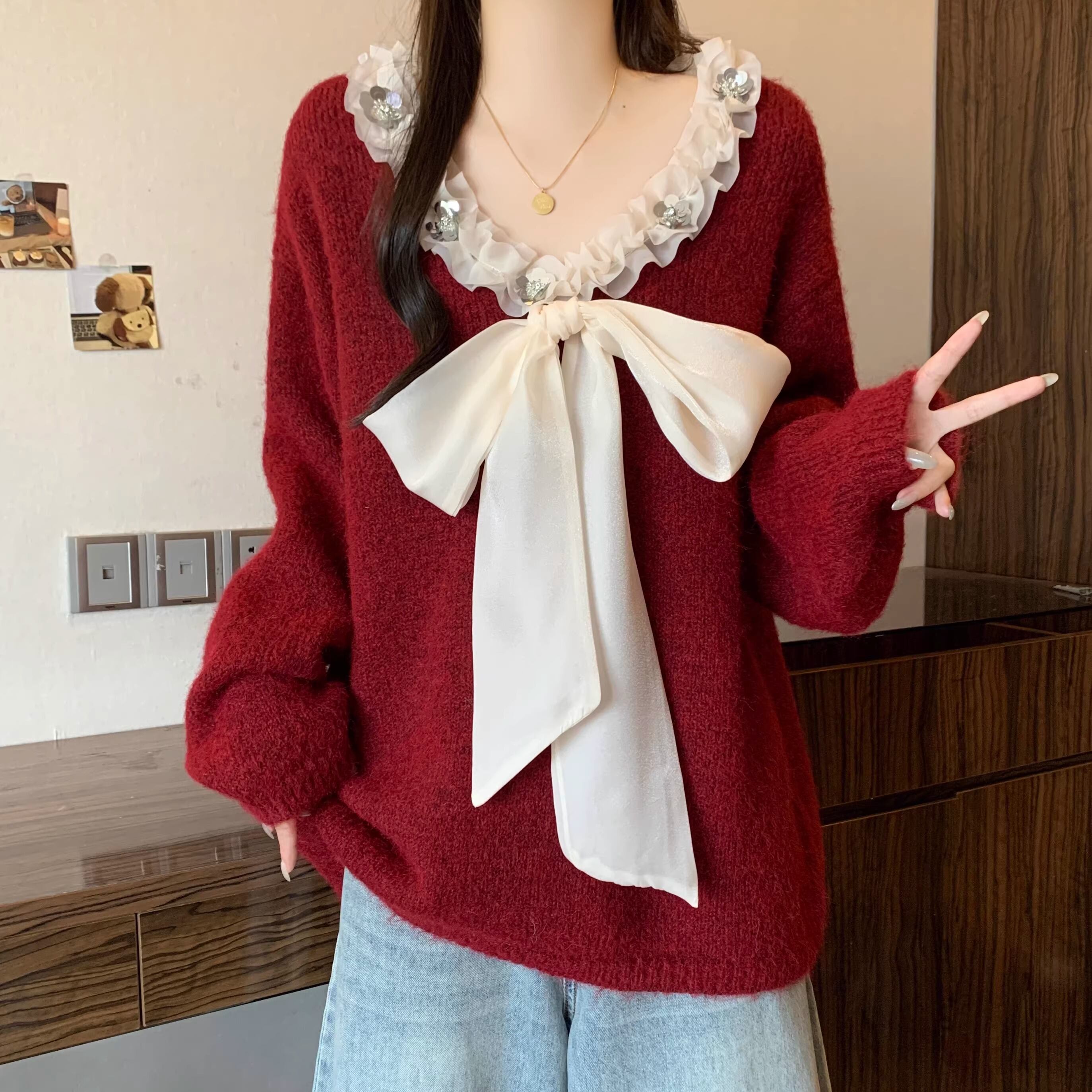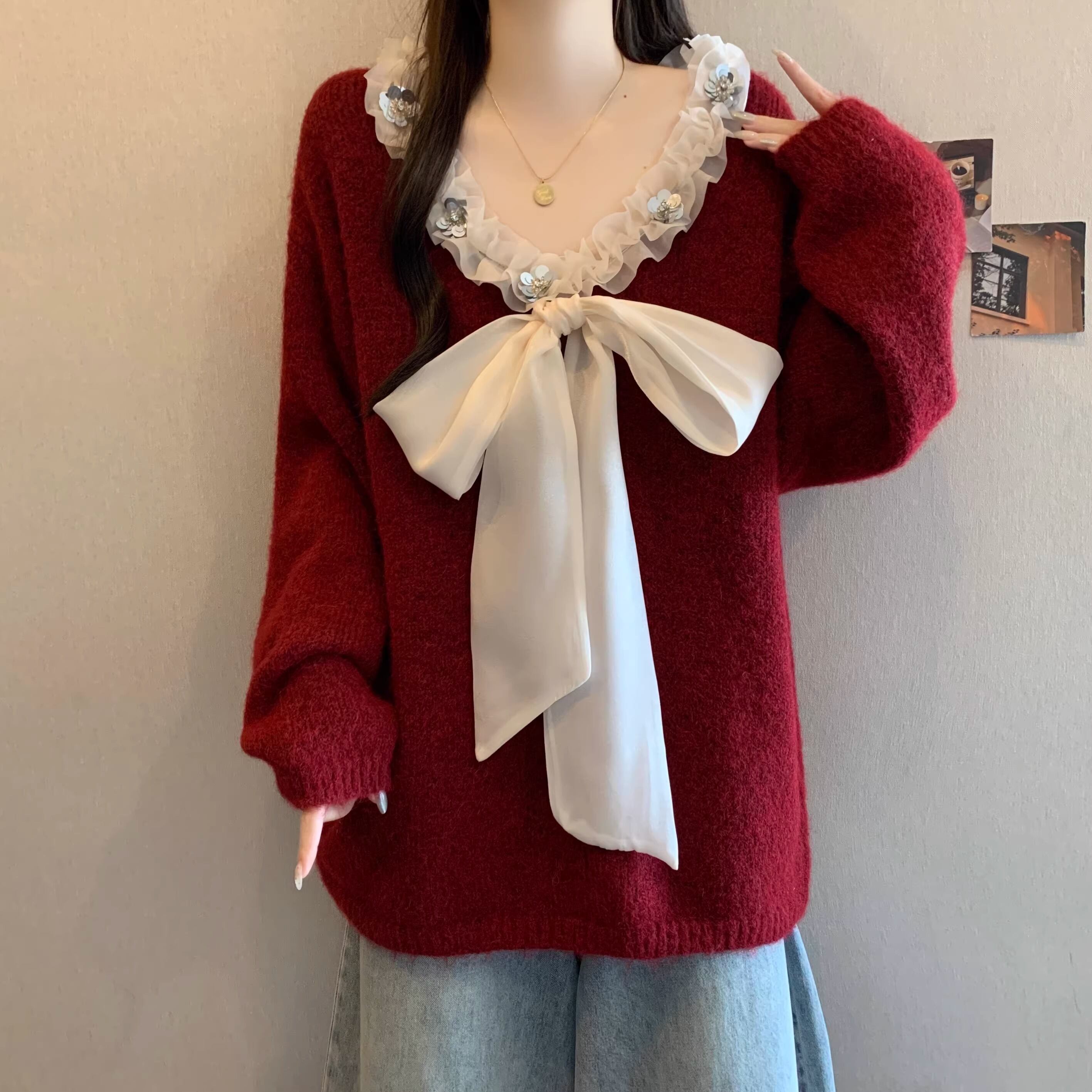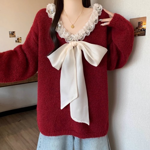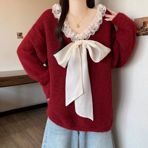 2色/フロントリボンフラワーラメニットトップス ・73833
