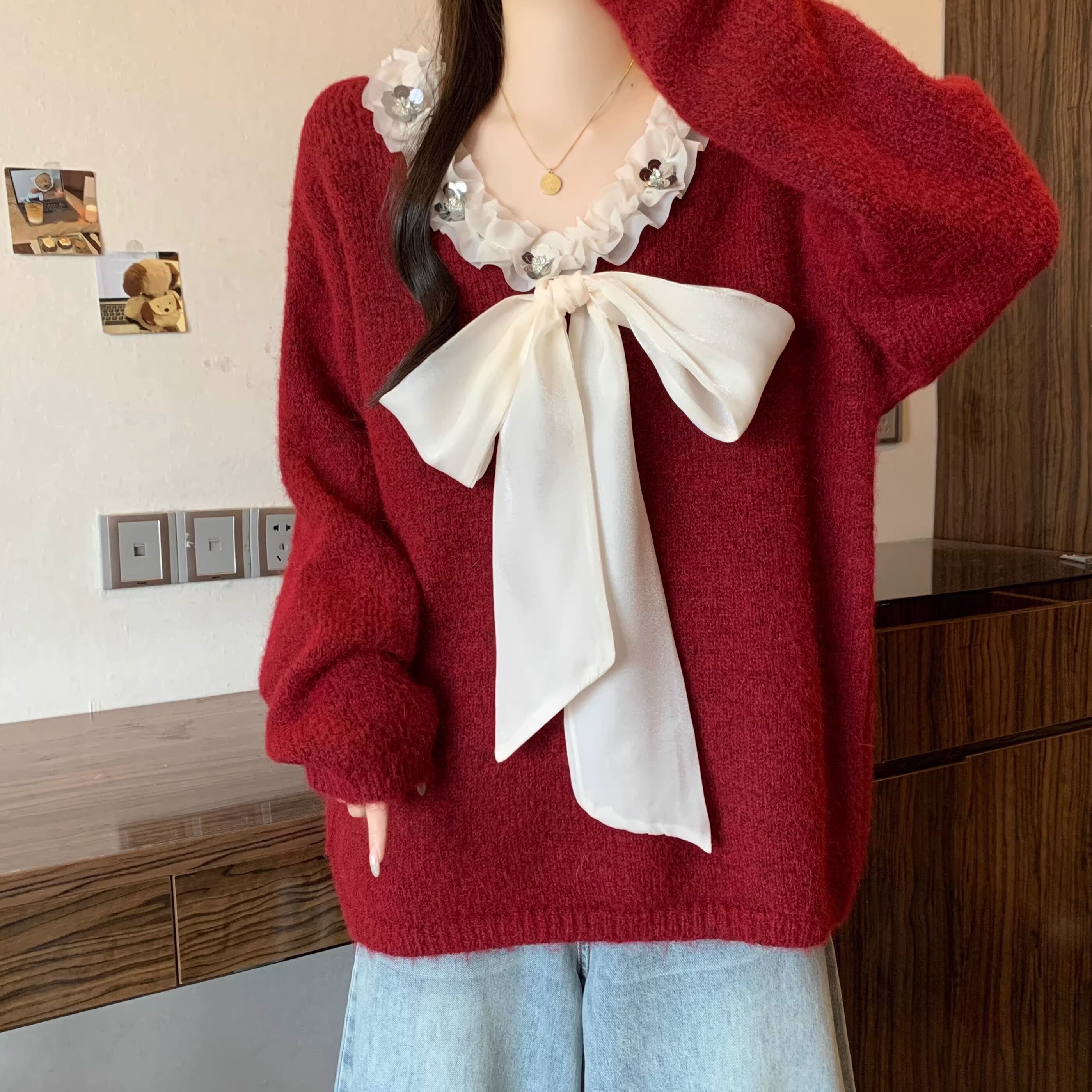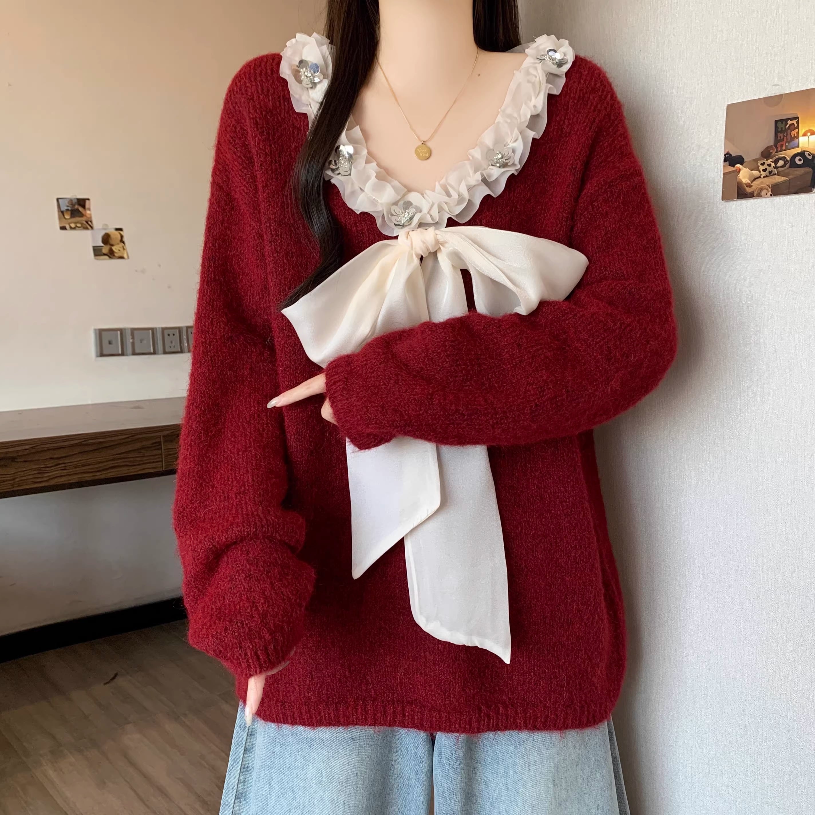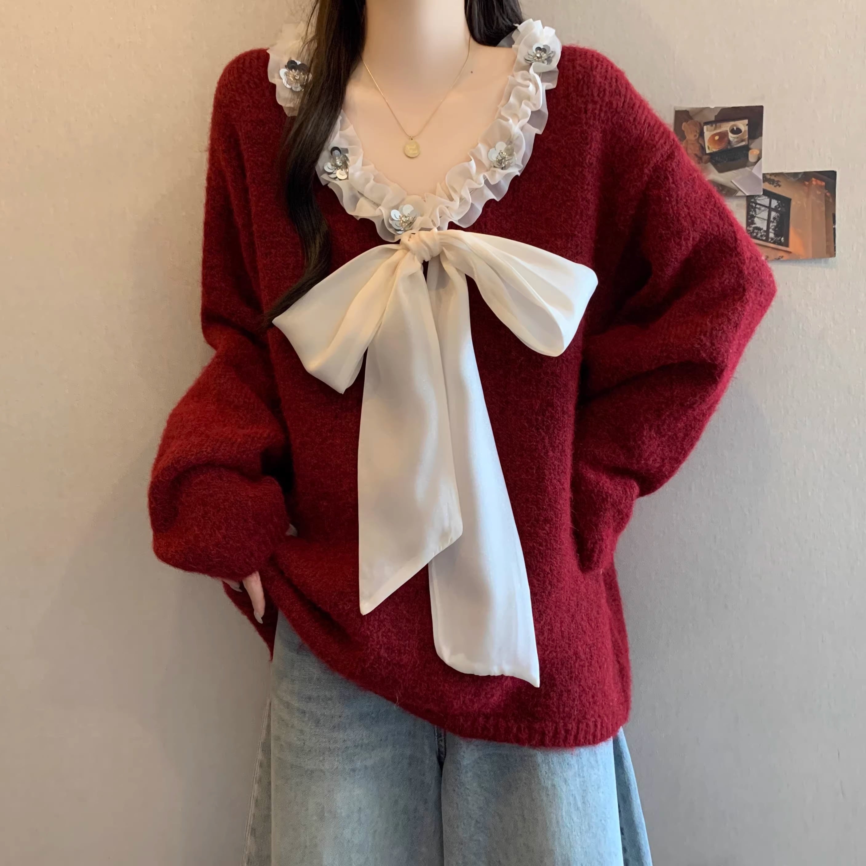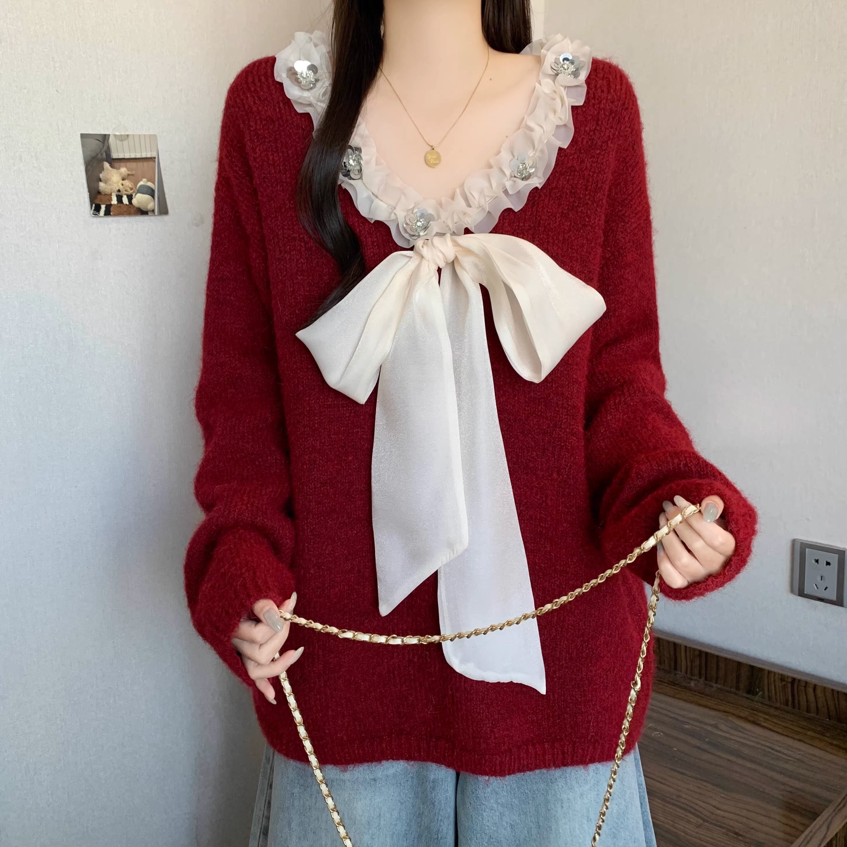 2色/フロントリボンフラワーラメニットトップス ・73833