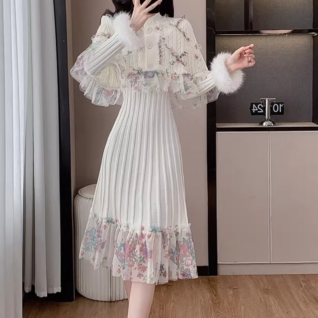 【2点セット】2色/Vネックニットワンピ+フリルヘムケープ ・74013