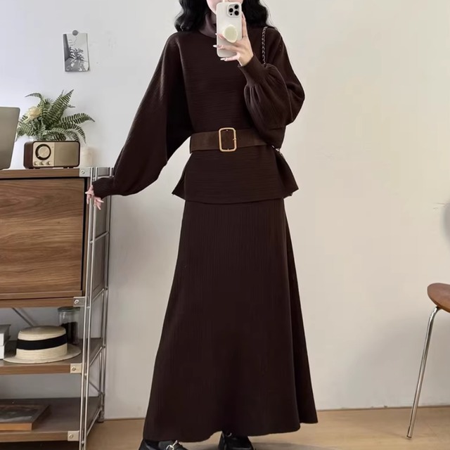 【2点セット】2色/パフスリーブタートルニットトップス+マキシスカート+ベルト ・73973
