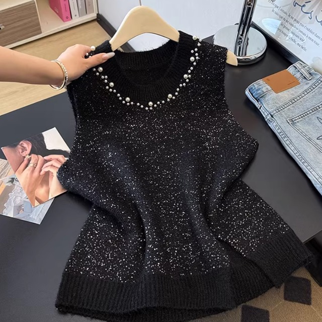 2色/パールトリムラウンドネックノースリトップス ・73956
