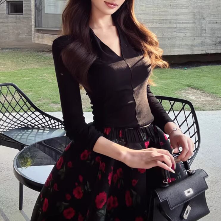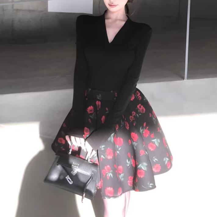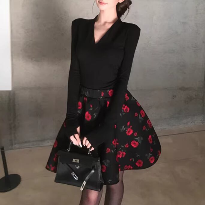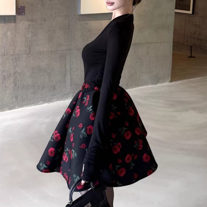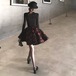 【2点セット】2色/ハイネックトップス+サイドベルトチェックジャンスカ ・72066