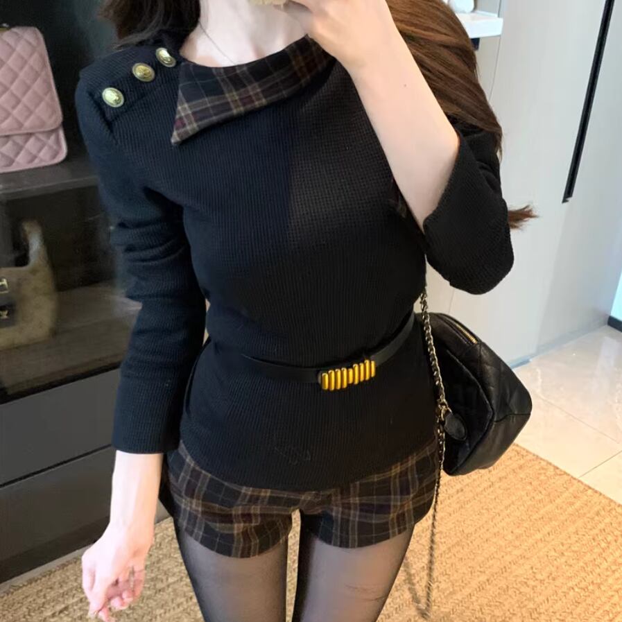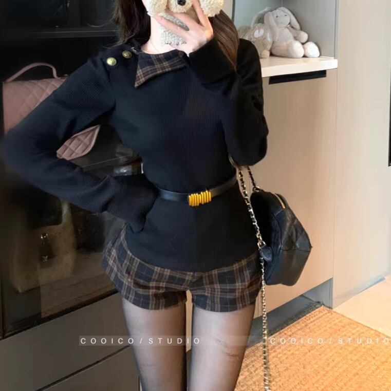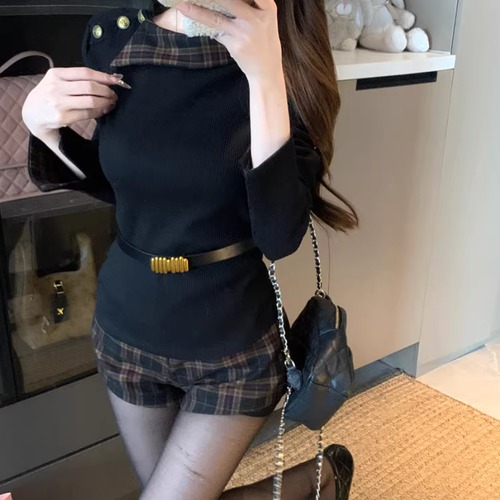 【2点セット】2色/ハイネックトップス+サイドベルトチェックジャンスカ ・72066