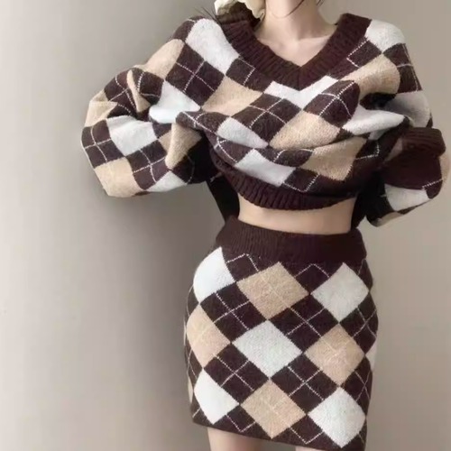 【2点セット】2色/ハイネックトップス+サイドベルトチェックジャンスカ ・72066