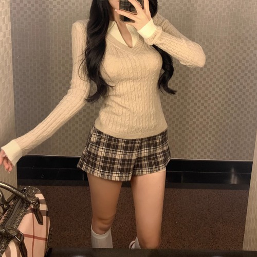 【2点セット】2色/ハイネックトップス+サイドベルトチェックジャンスカ ・72066