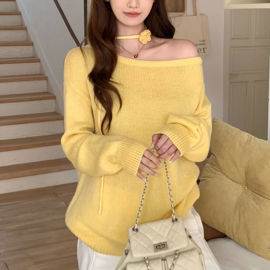 【2点セット】2色/ラウンドネックコンパクトリブニットトップス+スリムマフラー ・74475