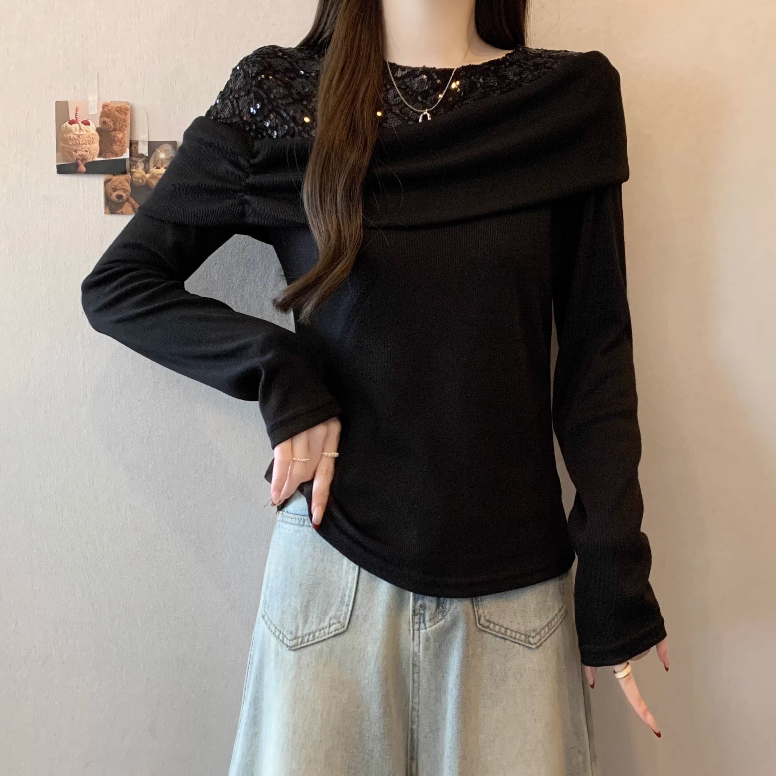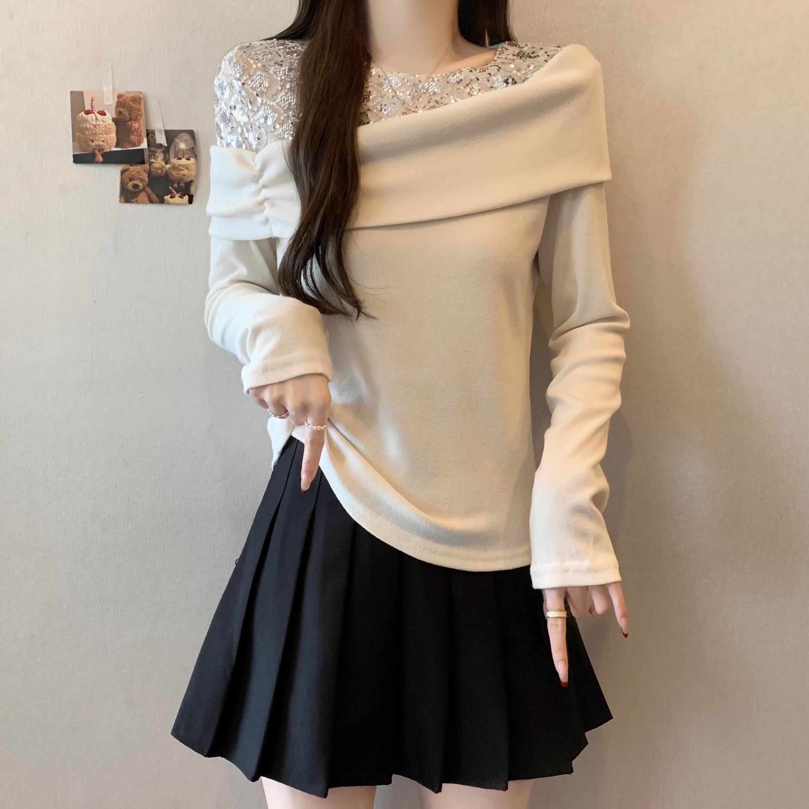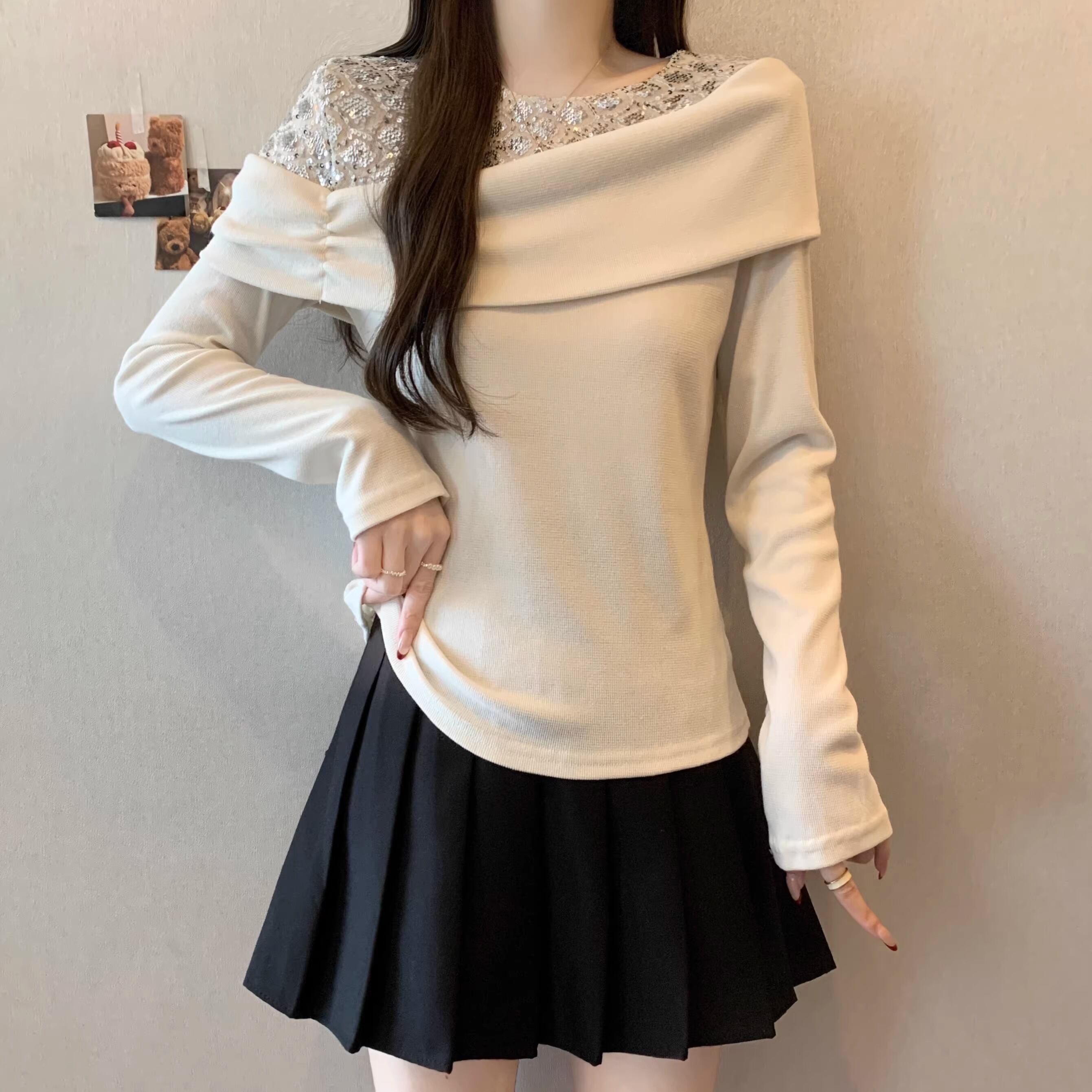【2点セット】2色/ラウンドネックコンパクトリブニットトップス+スリムマフラー ・74475