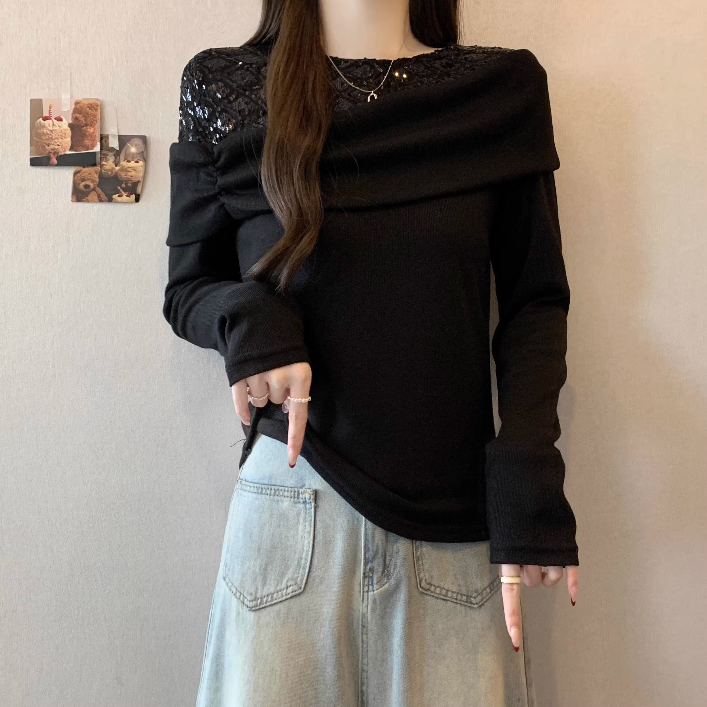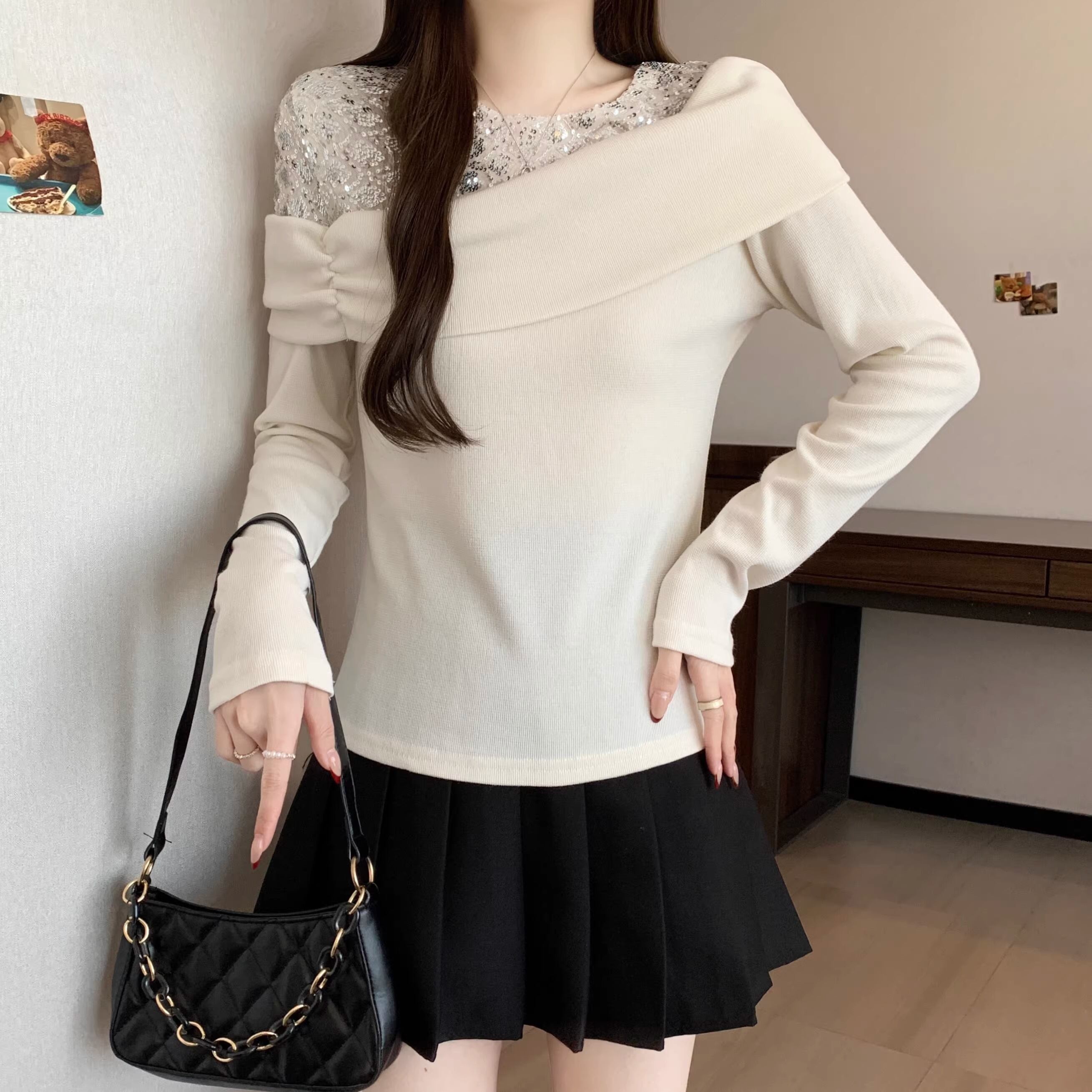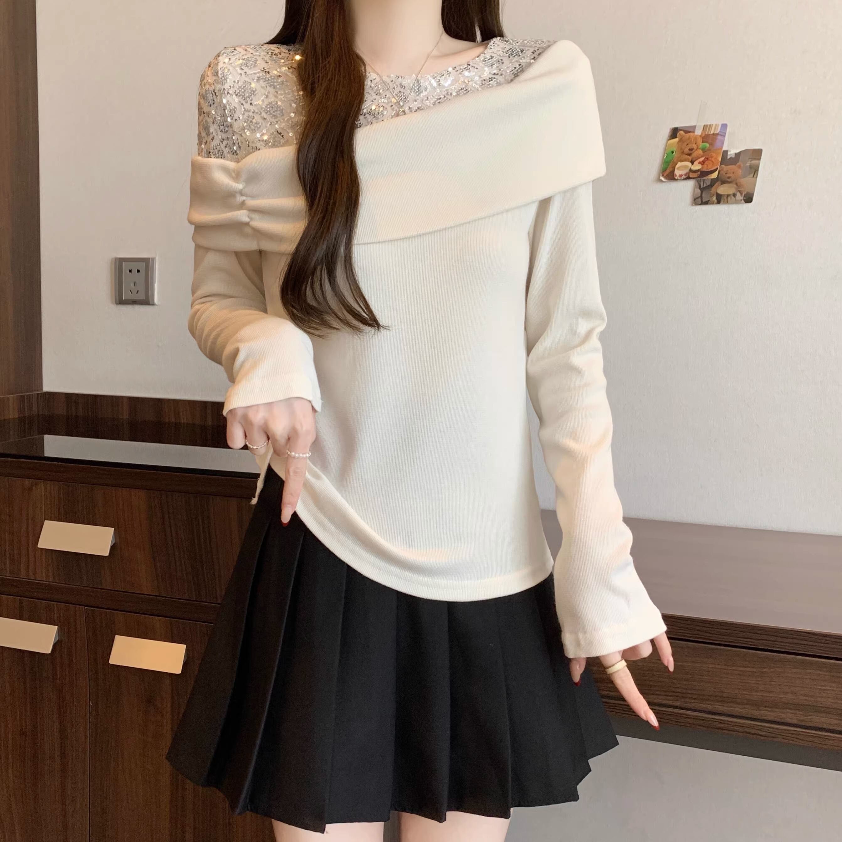 【2点セット】2色/ラウンドネックコンパクトリブニットトップス+スリムマフラー ・74475