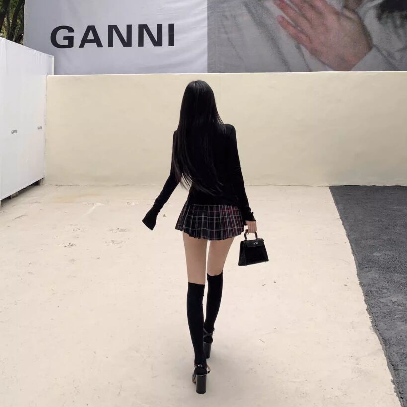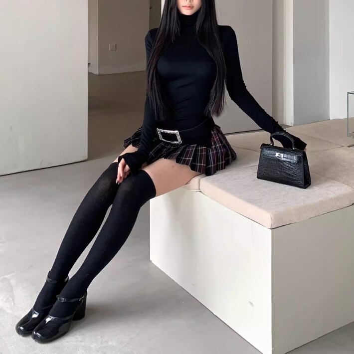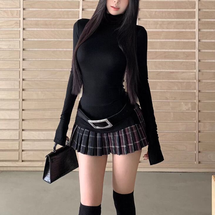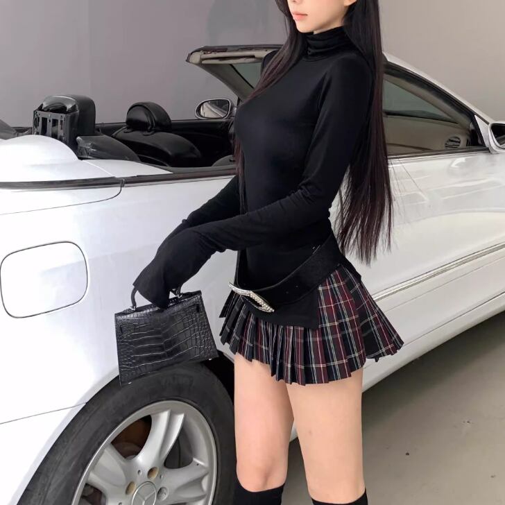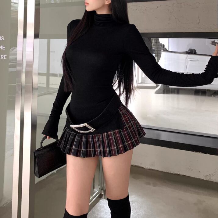【2点セット】2色/ハイネックトップス+サイドベルトチェックジャンスカ ・72066