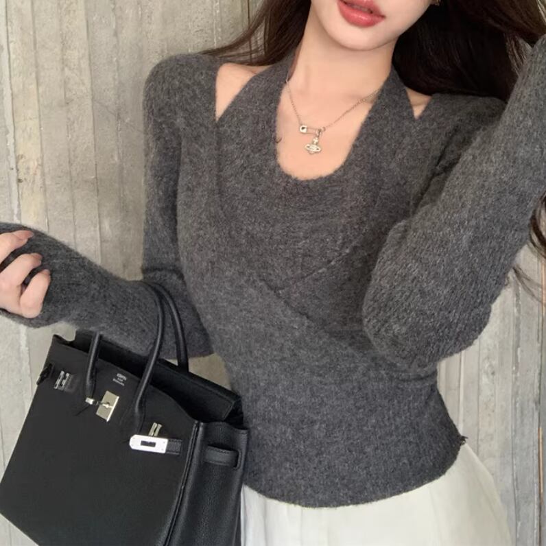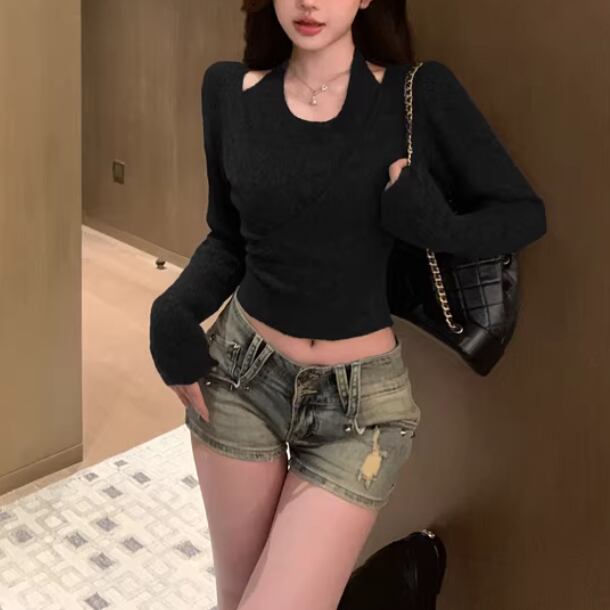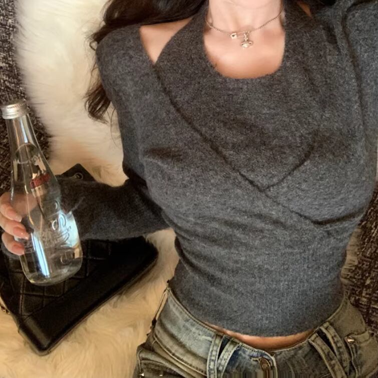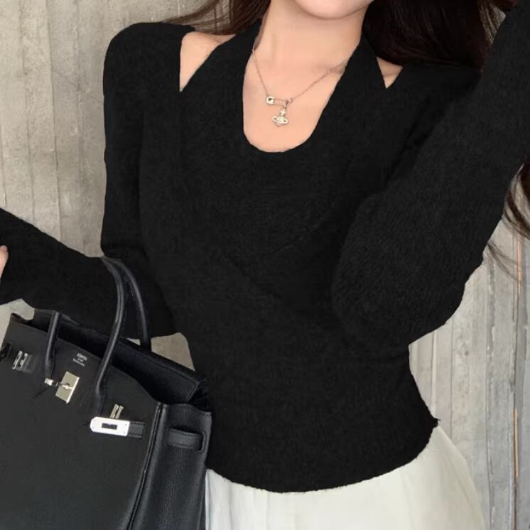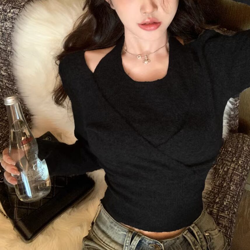 【2点セット】2色/ラウンドネックコンパクトリブニットトップス+スリムマフラー ・74475