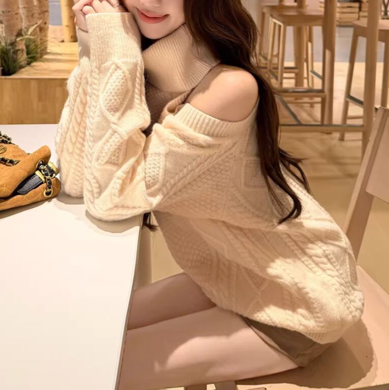 【2点セット】2色/ラウンドネックコンパクトリブニットトップス+スリムマフラー ・74475