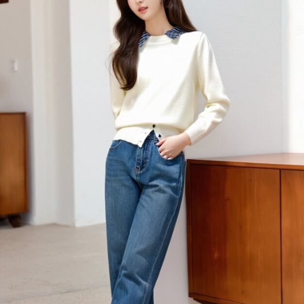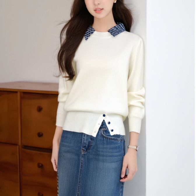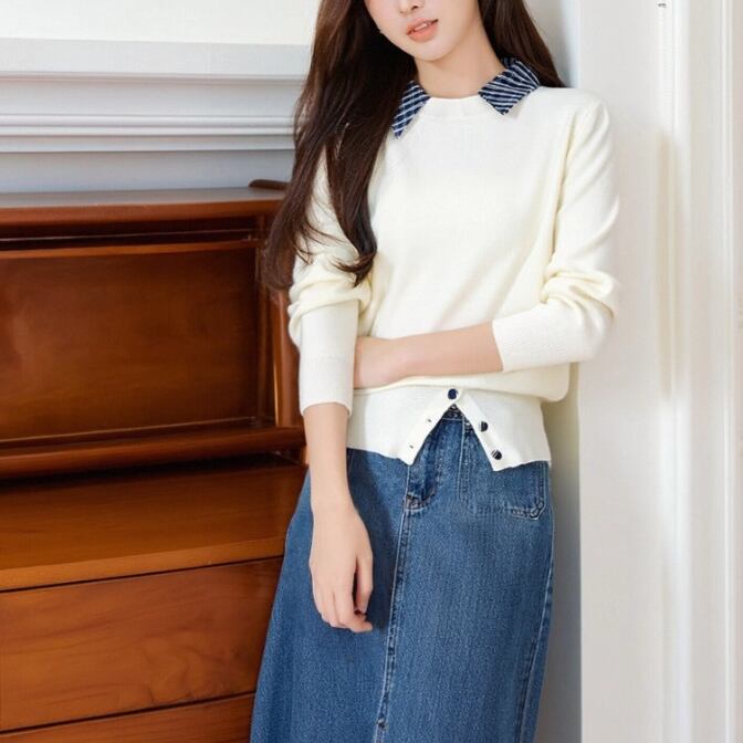 レースカラーアシメボタンドッキングトップス ・71106