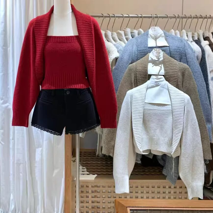 【2点セット】3色/リボンノーボタンカーデ+フリルペプラムキャミソール ・74597